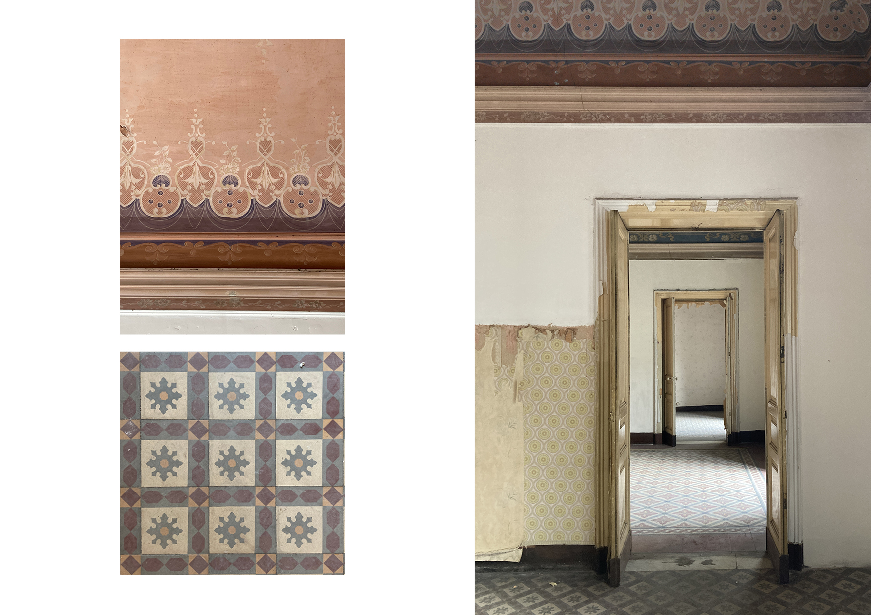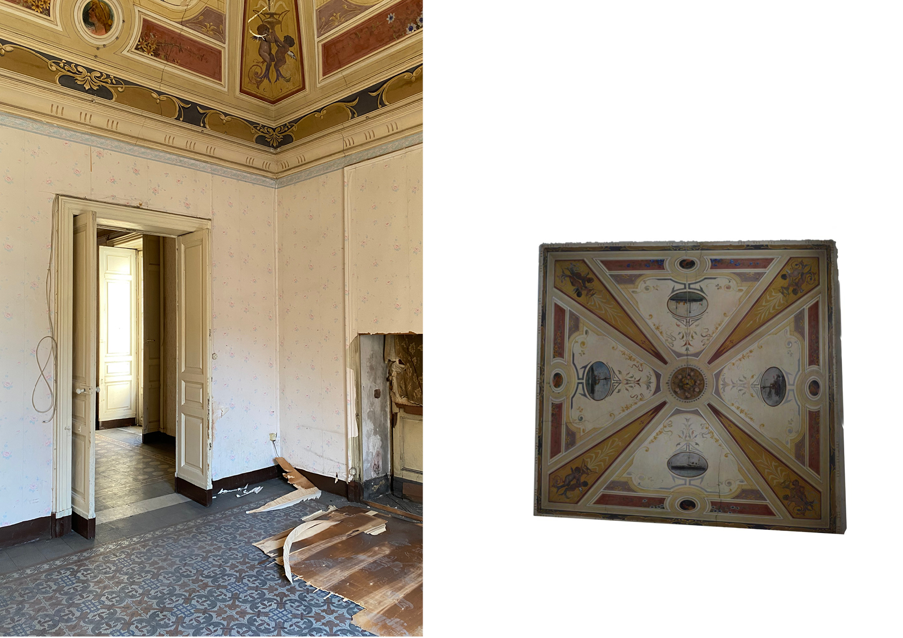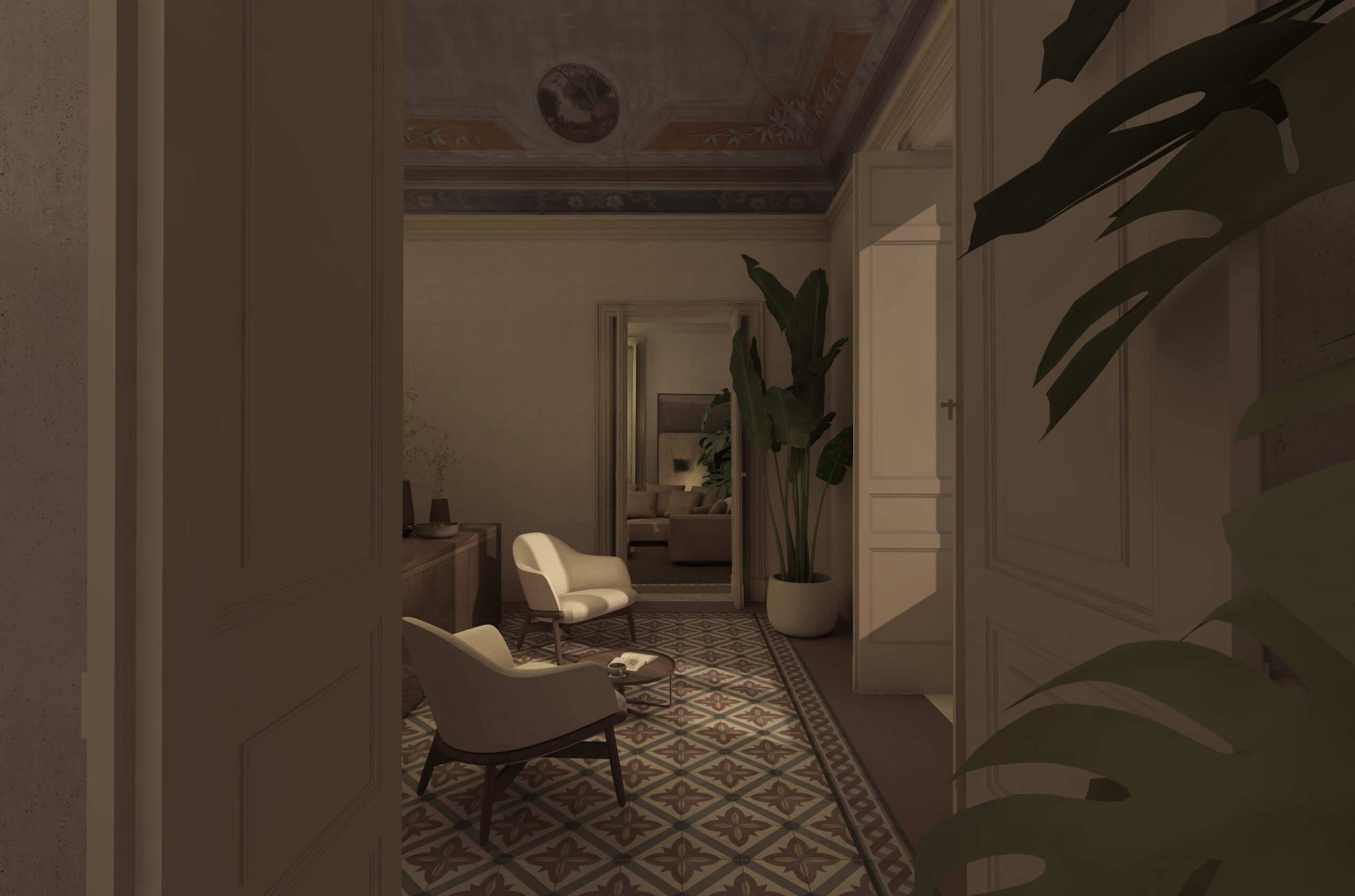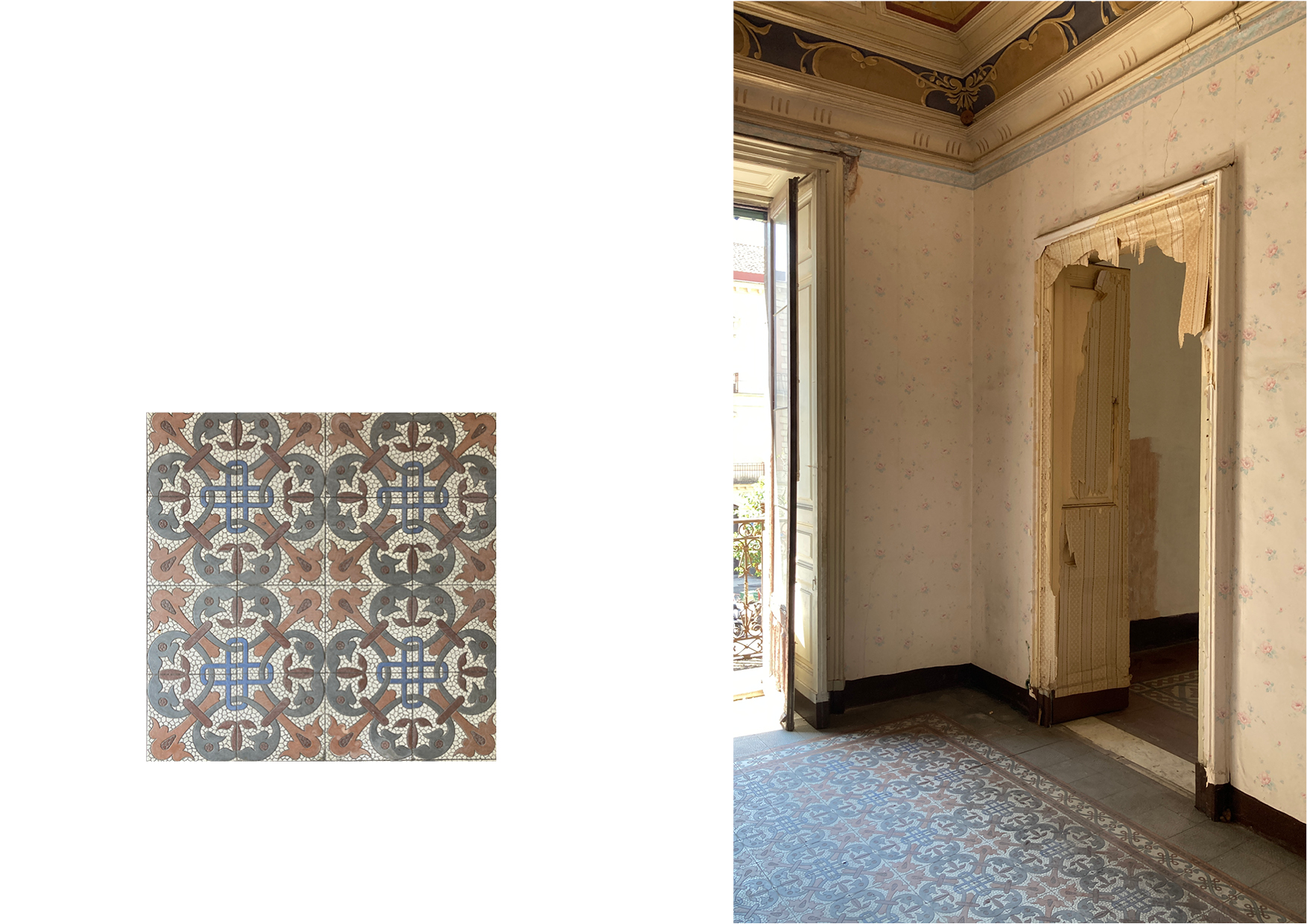 Contrariamente al volto della Catania greco-romana, medievale, e ancor di più barocca, il volto della Catania Liberty è più celato e intimo. La residenza presenta un affascinante connubio cromatico e figurati- vo evidente soprattutto nelle volte a crociera e nella pavimentazione in cementine, entrambe decorate da differenti motivi e pattern in ciascun ambiente. L’utilizzo di un’ampia gamma cromatica e figurativa rende evidente la commistione di emozioni e sensazioni diverse in re- lazioni alle distinte spazialità di cui l’appartamento è costituito. L’appartamento si compone di un piano nobile e un ammezzato. Il primo è caratterizzato da quattro ambienti principali voltati con un’altezza di quasi cinque metri, che godono della relazione con la città e della migliore esposizione solare, e da un ambiente frammentato in vani irregolari di servizio che il progetto intende unificare. Il piano ammezzato, con accesso sia servito dalla scala comune sia da un’interna, insiste sopra gli ambienti di servizio del piano nobile ed in passato era destinato ad accogliere gli alloggi del personale domestico.