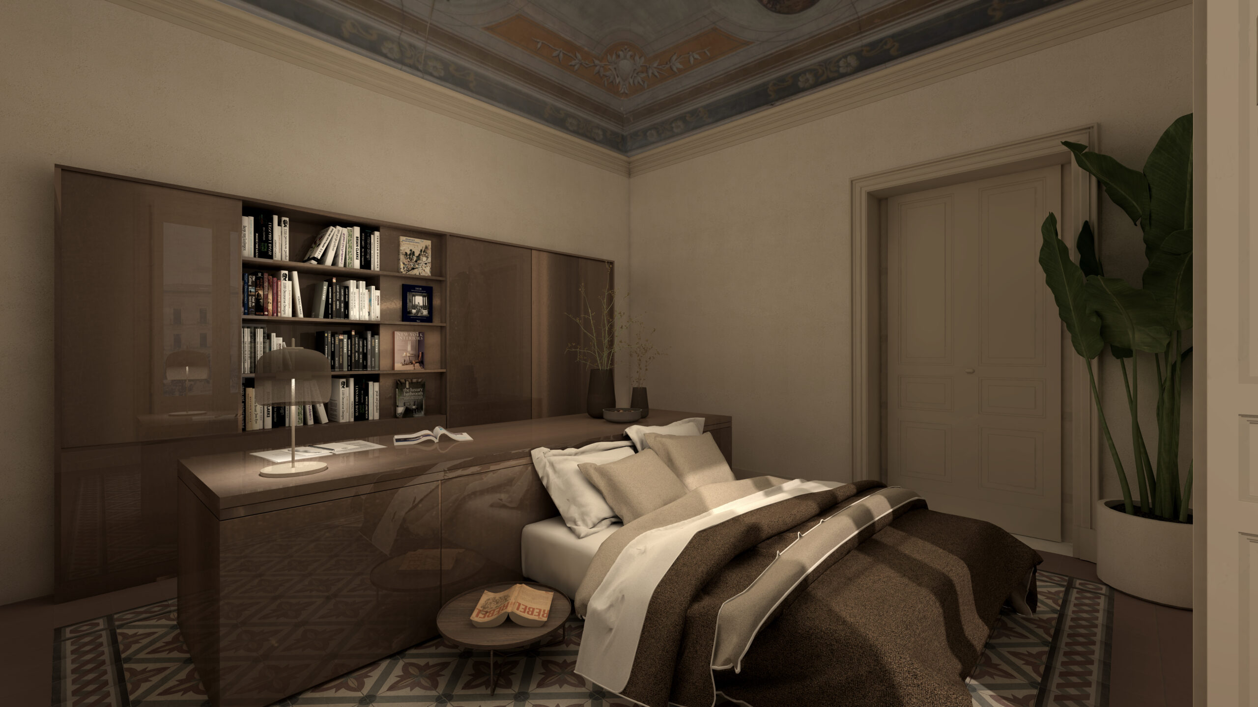 Al centro dell’appartamento, tra il living e la stanza padronale, la lounge room riveste un ruolo fondamentale poiché permette la circolarità della fruizione degli ambienti e l’organizzare dello spazio domestico in modo versatile. Il progetto prevede la realizzazione di due arredi, uno a parete che include la porta e la libreria e l’altro centrale e versatile, da cui è possibile ricreare tre configurazioni: di conversazione ed in- contro, di studio o lavoro ruotando il piano che diventa scrivana, ed infine la possibilità di convertirla in stanza per gli ospiti aprendo il letto matrimoniale contenuto all’interno dell’arredo.