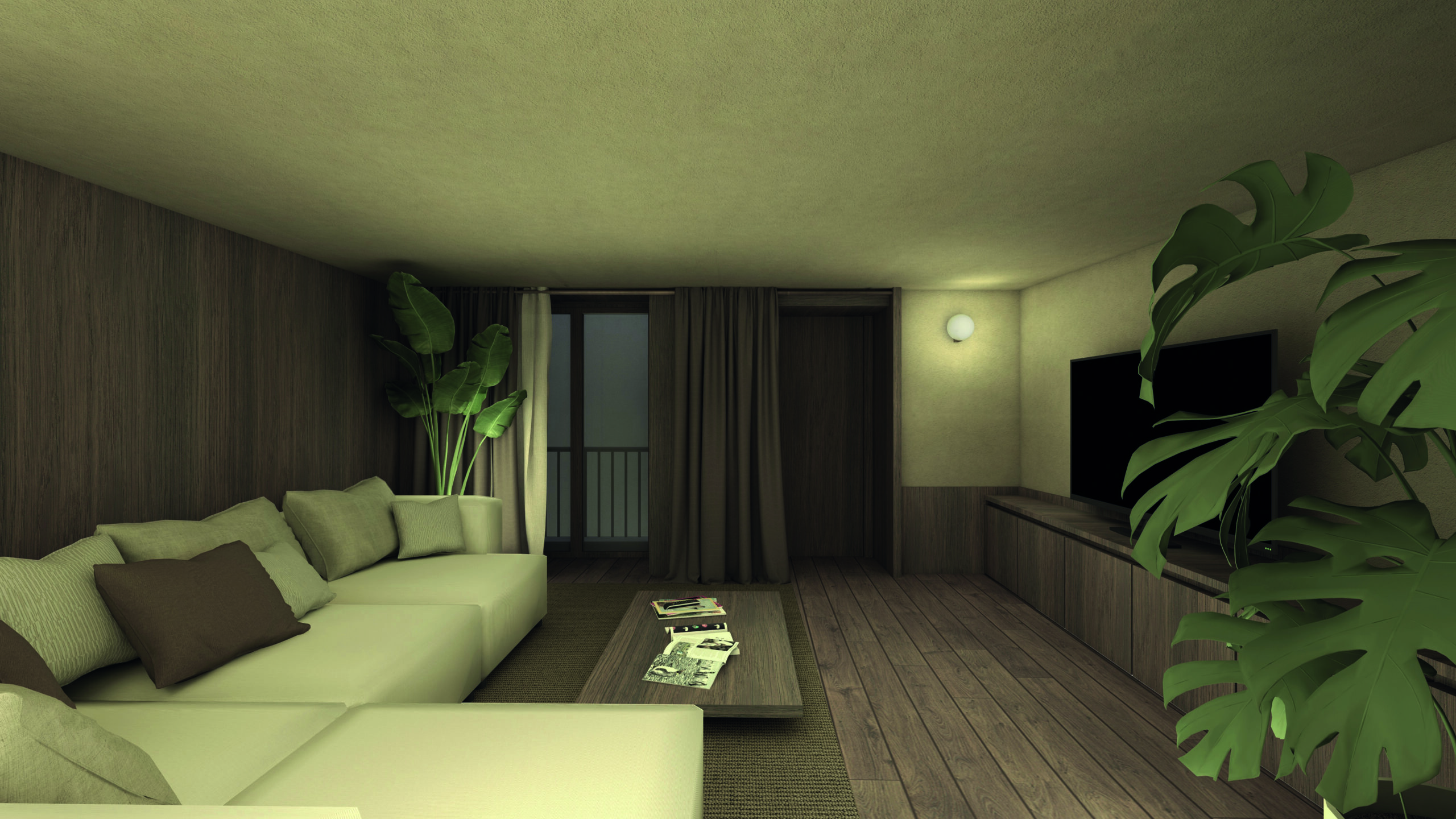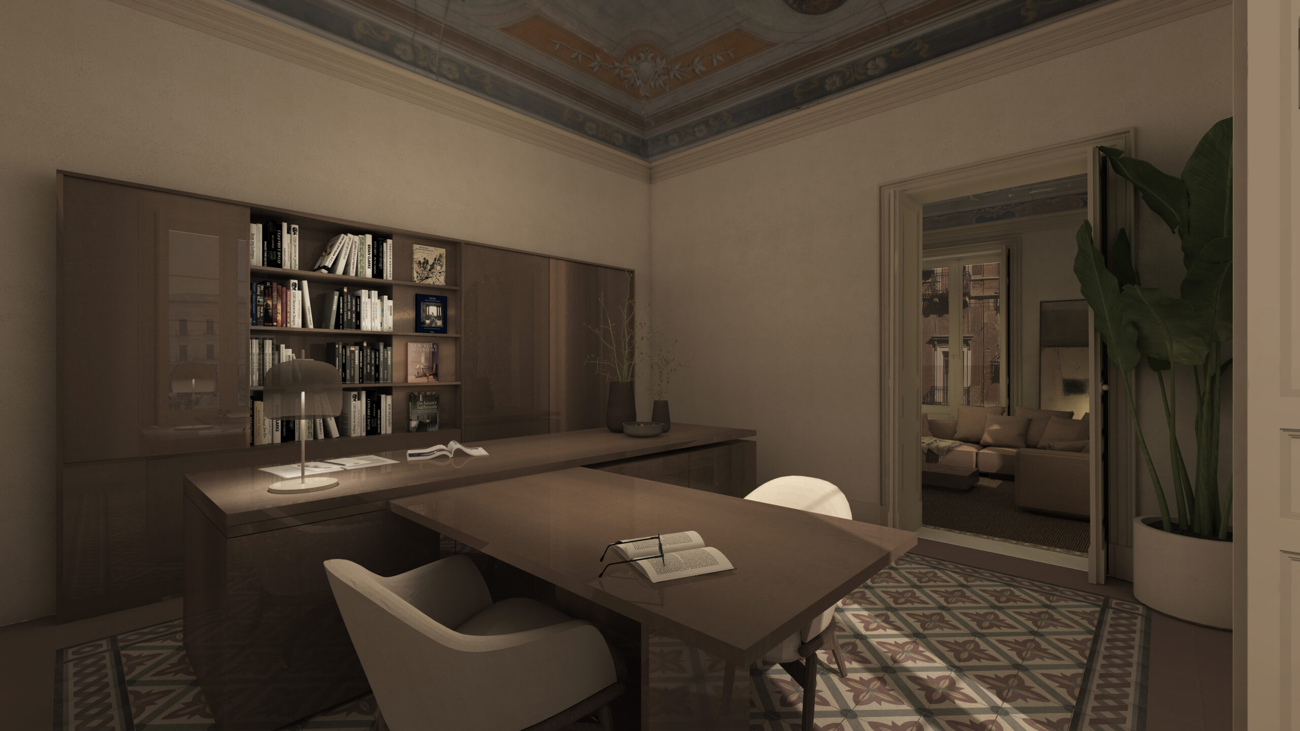 Nella percezione dello spazio le regole di fruizione compositive ed estetiche si sfumano, lasciando spazio a percezioni sottili, personali, che afferiscono alla sfera emotiva più che a quella cognitiva, entrando in uno “spazio” abitato da sensazione captate “dalla pelle” come ricorda J. Pallasmaa nel testo “The eyes of the skin”. Il progetto architettonico e di interior indaga e coniuga le esigenze emotive delle persone, nella realizzazione dei luoghi e delle atmosfere della propria vita, cosciente di come queste incidono sulla percezione della pro- pria identità personale, sulle relazioni e sul benessere psicofisico. ’ambiente principale dell’appartamento è il living room, da cui è possibile traguardare le stanze principali della casa. Il grande infisso di legno esposto a sud accoglie gli ultimi raggi del tramonto che colorano la stanza di ocra e donano un’atmosfera intima in cui abbandonarsi all’ozio di un libro o alle note di una brano musicale. Al centro della stanza il tavolo basso riflette le cromie della volta affrescata e le luci soffuse dell’ambiente, attorno a cui sono posizionati i divani che accolgono sia momenti di convivialità che di relax. Nella parete opposta un grande quadro di arte astratto, sostenuto da un arredo murale, cela la televisione.