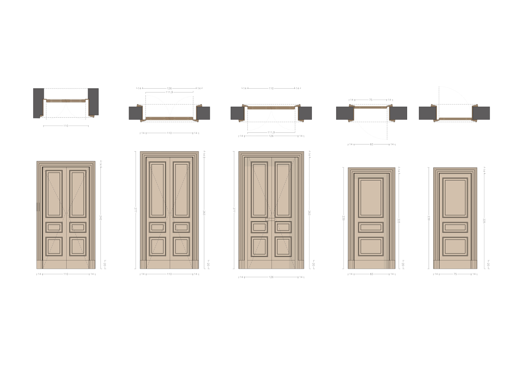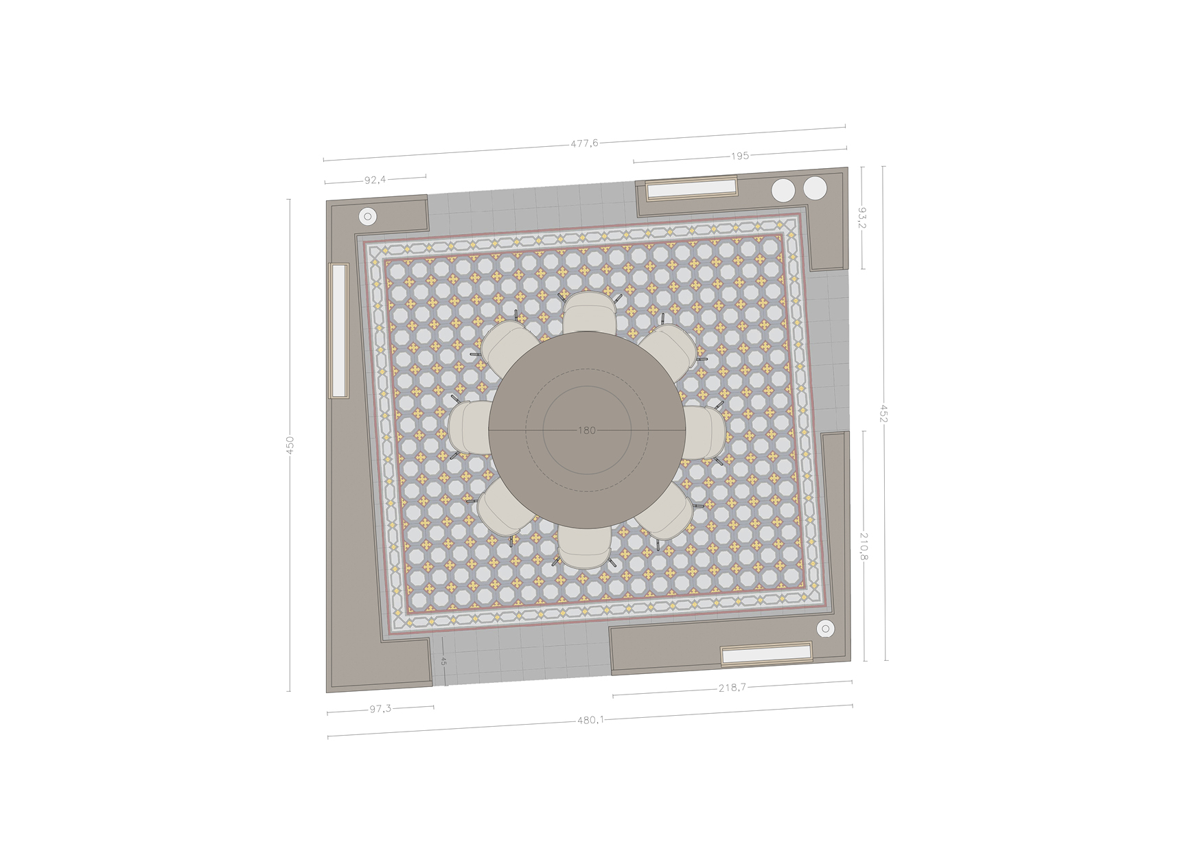 Nelle stanze voltate il progetto prevede la realizzazione di arredi su misura che rispettano i caratteri spaziali e materici dell’appartamento, quali la centralità degli ambienti voltati e la loro reciproca connessione, l’eleganza e la raffinatezza dei dettagli e dei decori. Gli arredi risolvono inoltre la complessa integrazione dell’impianto di climatizza- zione nelle dimore storiche celandone accuratamente le unità interne. Il materiale di finitura scelto per gli arredi è il legno laccato lucido o rivestito dal metallo, con la finalità di riflettere le cromie ed integrarsi nel complesso connubio cromatico e decorativo delle volte affresca- te e dei pattern della pavimentazione.