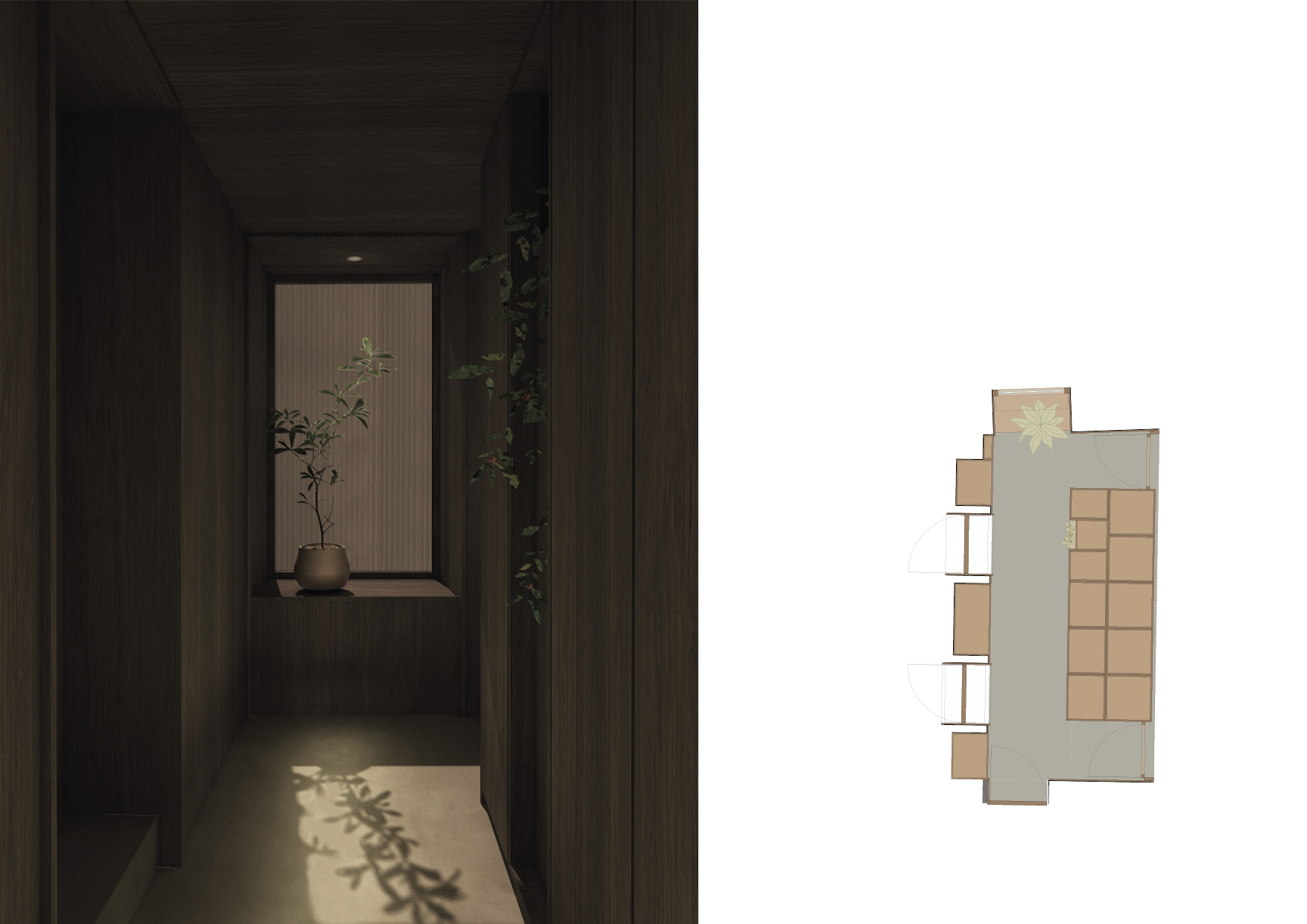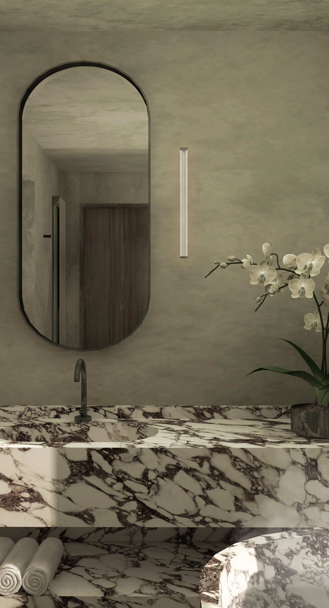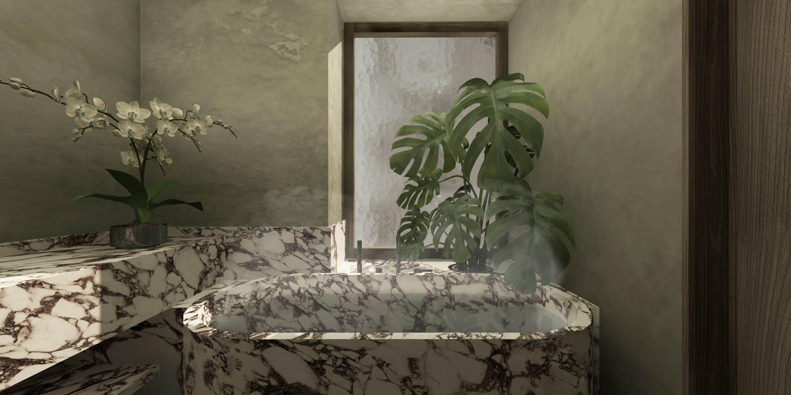 La vasca è ricavata da un blocco di marmo estratto dalle cave di Carrara, tagliato, scavato e riassemblato per permettere di apprez- zare al meglio il ricomporsi delle venature del materiale. La composizione definita dalla vasca e dalla finestra viene completato dalla presenza di una grande monstera deliziosa che ha lo scopo di filtrare, con le sue grandi foglie, la luce proveniente dall’apertura resa ancor più poetica dal vapore del bagno caldo.