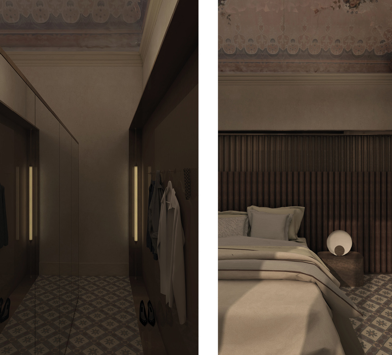 Il progetto s’inserisce in tale complessità spaziale, cromatica e figurativa ed è il risultato di un attento percorso di ricerca orientato verso l’uso di materiali legati alla tradizione costruttiva locale, sostenibili, tra- spiranti e compatibili con i materiali e le cromie presenti, al fine di custodire i caratteri dell’appartamento senza rinunciare a un’interpreta- zione contemporanea del progetto. In tale direzione sono preservati tutti gli elementi originari e caratterizzanti dell’abitazione tra cui gli affreschi presenti nelle volte, la pavimentazione in cementine e gli infissi esterni ed interni, quest’ultimi resi compatibili con le nuove esigenze funzionali e di prestazioni energetiche. L’intervento edilizio prevede, al primo piano, la ridefinizione della spazialità di ingresso destinata ad ospitare la cucina, un disimpegno e due bagni mentre, al piano ammezzato, la demolizione delle pareti favorisce la definizione di superfici più ampie. Più complesso è stato rispettare i bisogni specifici dei committenti e coniugarli con tutte le esigenze funzionali, tecniche ed estetiche in piena armonia definendo un progetto d’interior design “cucito” addosso ai vari ambienti come un abito di sartoria.
