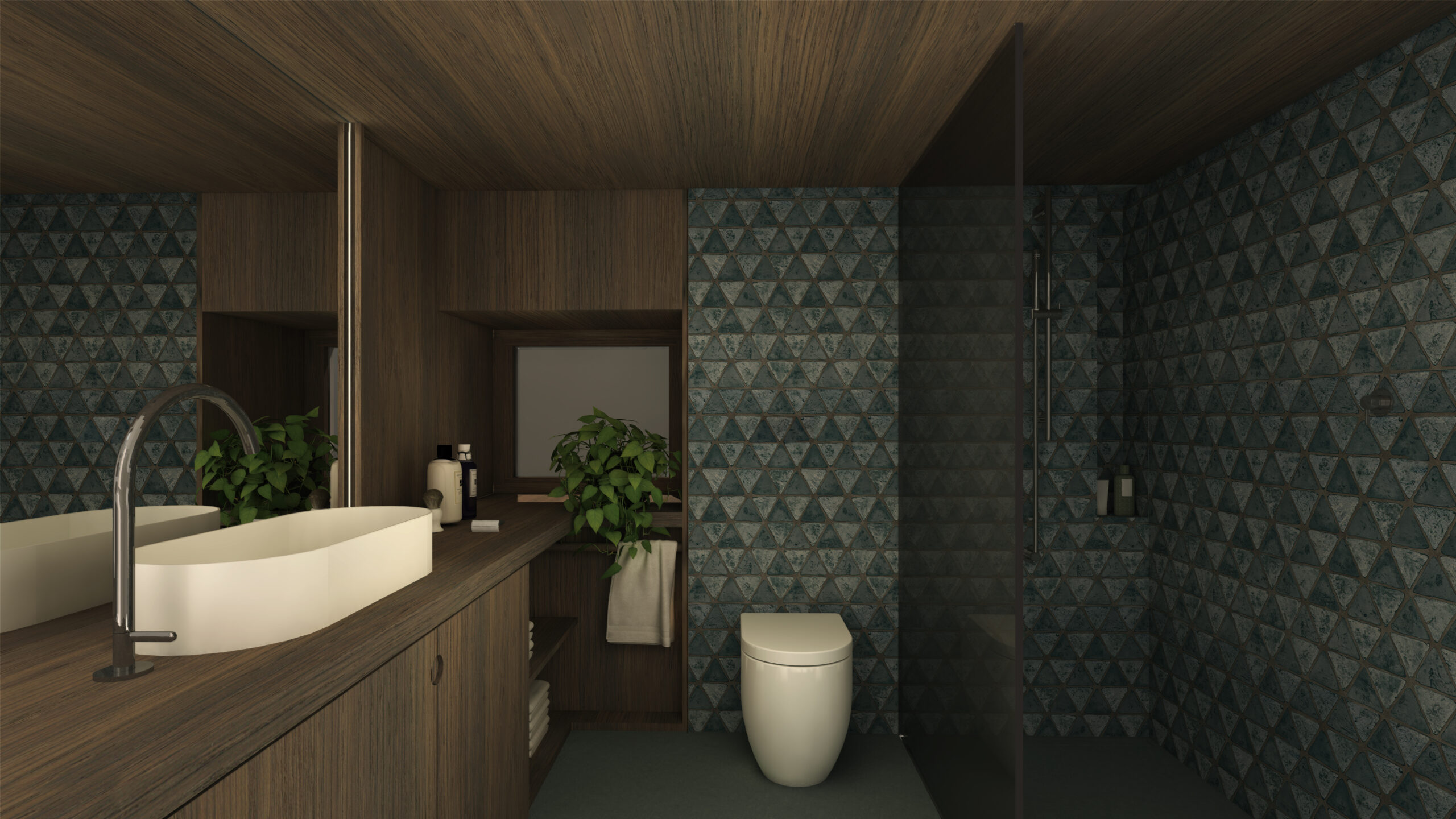 Dalla dressing area è possibile accedere al corridoio che serve i due bagni padronali, spazi intimi e privati, progettati curando nel dettaglio l’aspetto materico e cromatico al fine di generare atmosfere rilassanti proprie del wellness. Il primo bagno, declinato al maschile, è caratterizzato dall’utilizzo del travertino noce tagliato al verso che, rivestendo interamente la doccia, rimanda ad un’atmosfera ipogea ed enfatizzata dal vapore.