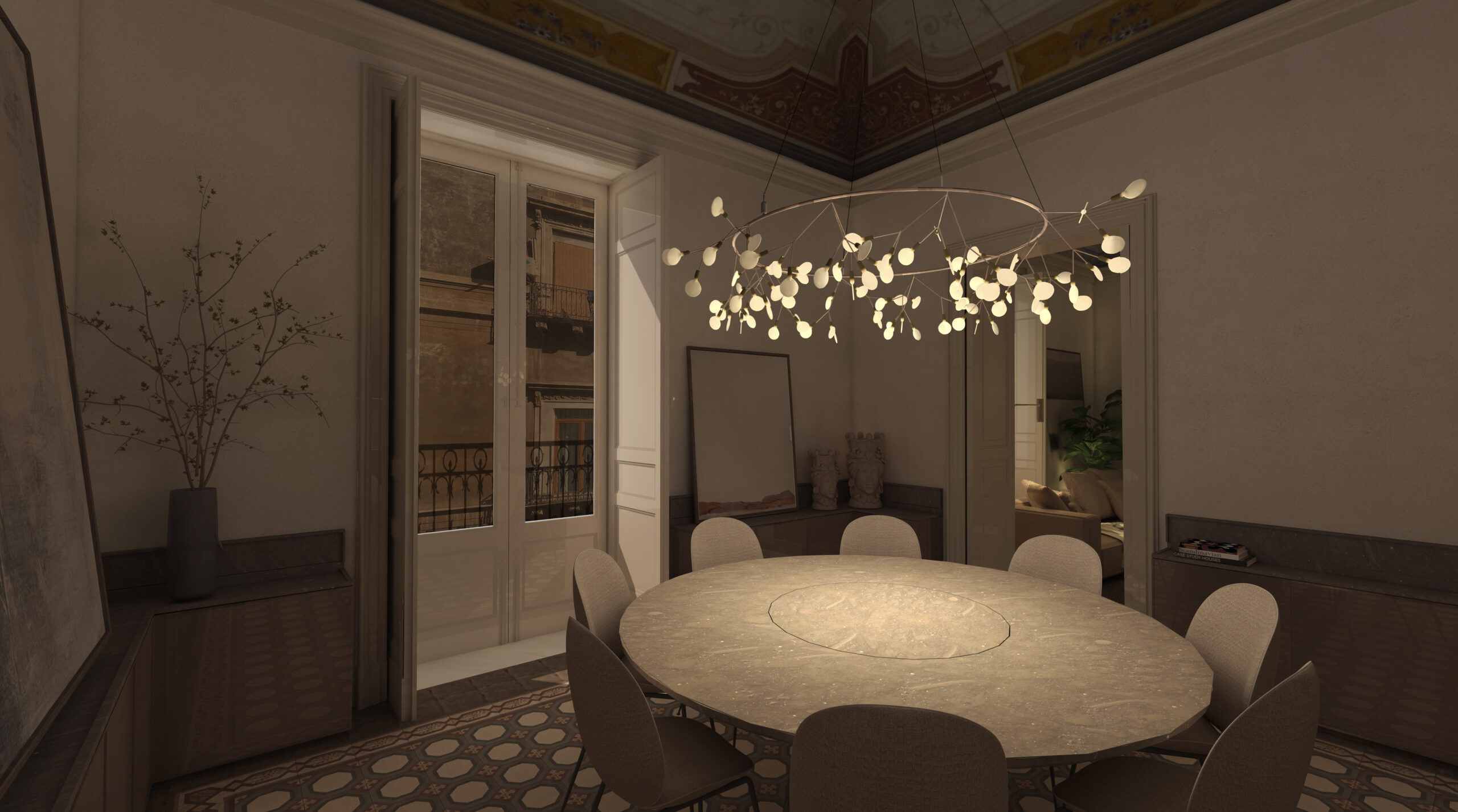 La dining room è il nodo tra il living e la cucina al cui centro si colloca il tavolo rotondo in marmo, espressione del piacere di stare a tavola e di condividere, in famiglia o con amici, una cena in armonia e tranquillità illuminati dai “petali” di vetro della lampada. Questo spazio è inoltre definito da un arredo perimetrale che raccorda la geometria della pavimentazione con l’irregolarità della stanza, contenitore ma anche palcoscenico di ricordi in un cui collocare ed esporre oggetti “raccolti” durante gli itinerari alla scoperta della Sicilia.