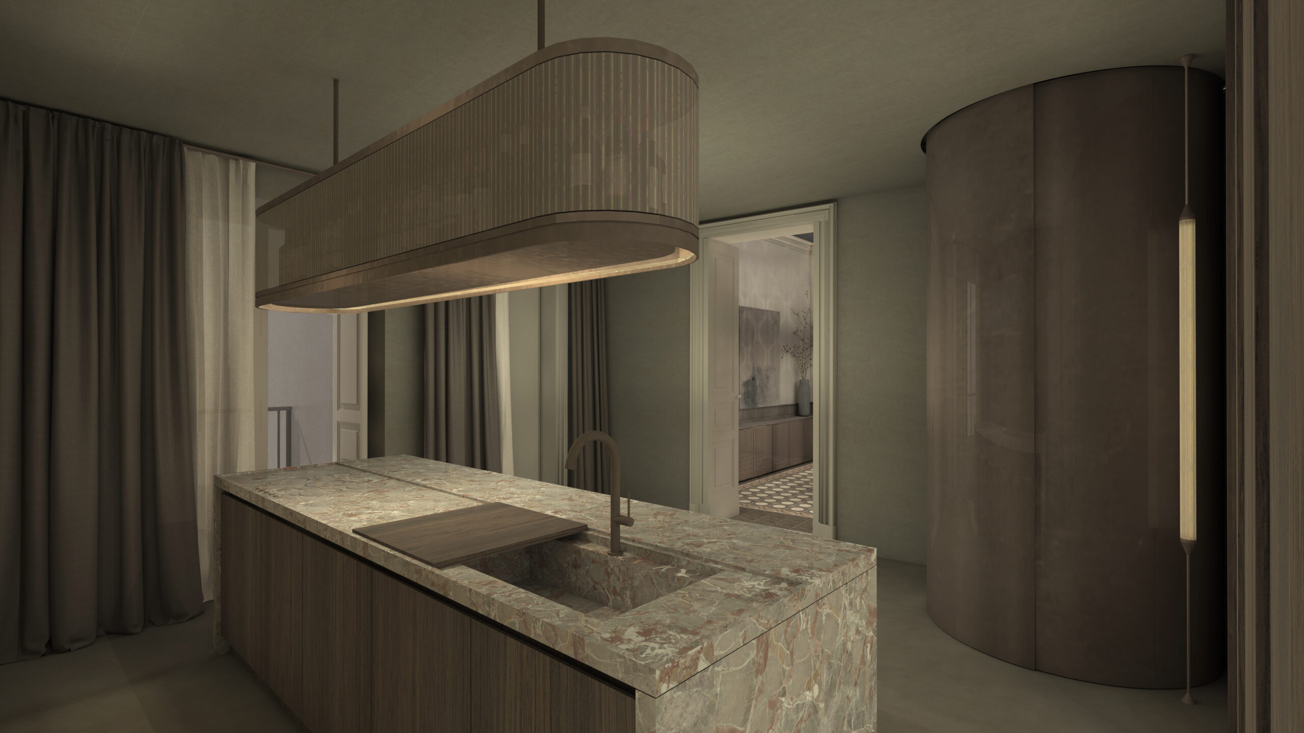 Lo spazio antistante ai due bagni è progettato come uno scatola lignea, composta da boiserie e arredi della stessa essenza ed illumina- to da una finestra dal vetro opaco e materico, cornice di una composizione botanica. Due porte laterali in ottone e vetro dalle linee retrò permettono di accedere alla cucina. La cucina è pensata come spazio scenico e teatrale in cui la famiglia e gli ospiti possono partecipare alla preparazione delle ricette della ricca tradizione culinaria siciliana e internazionale. Il progetto dell’isola traduce formalmente il tema della convivialità, in una visione esperienziale moderna del cucinare, mettendola in relazione visiva con la dining room.