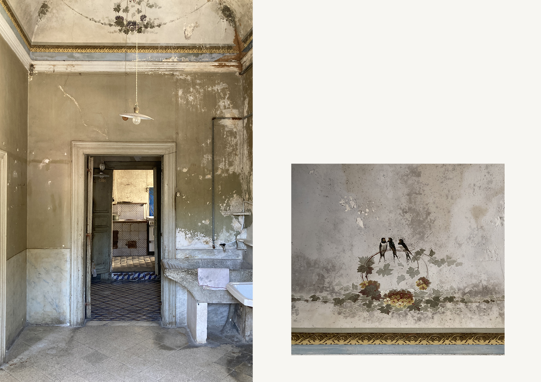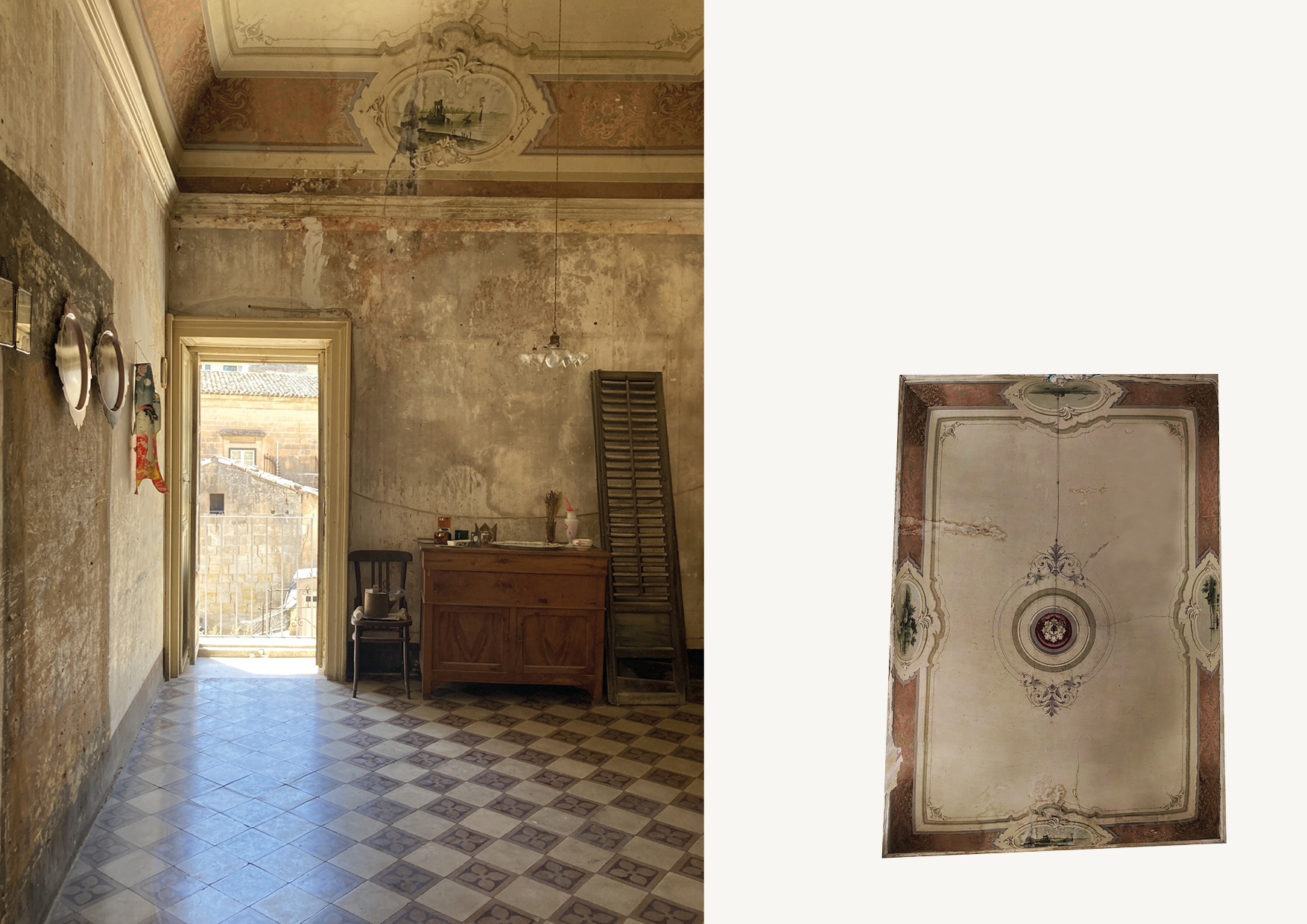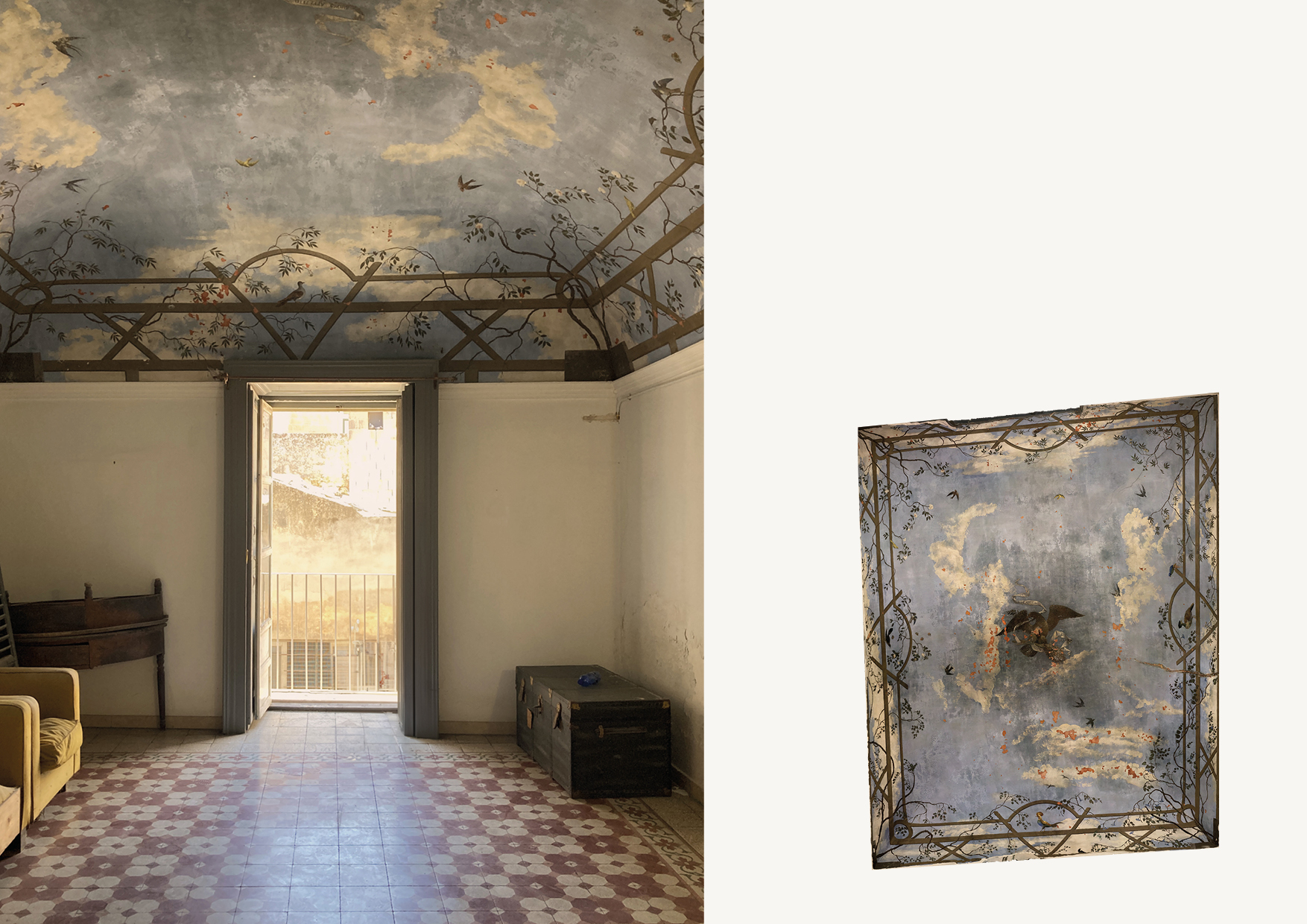 Nel palazzo si respira ancora un’atmosfera d’altri tempi, grazie allo splendido lavoro preciso e minuzioso svolto dalle maestranze ottocentesche sulle pavimentazioni, sulle volte ed infissi interni ed esterni. Quest’ultimi, infatti, sono caratterizzati da cornici ed elementi decorativi, e si innesta- no in maniera perfetta in ogni ambiente, grazie al sapiente lavoro degli artigiani curato in ogni minimo dettaglio. A decorare gli ampi saloni sono presenti volte affrescate realizzate in canne e gesso e le pavimentazioni in cementine del tempo, in cui colori, cromie, forme e geometrie si mescolano generando ambienti peculiari e unici nel suo genere.