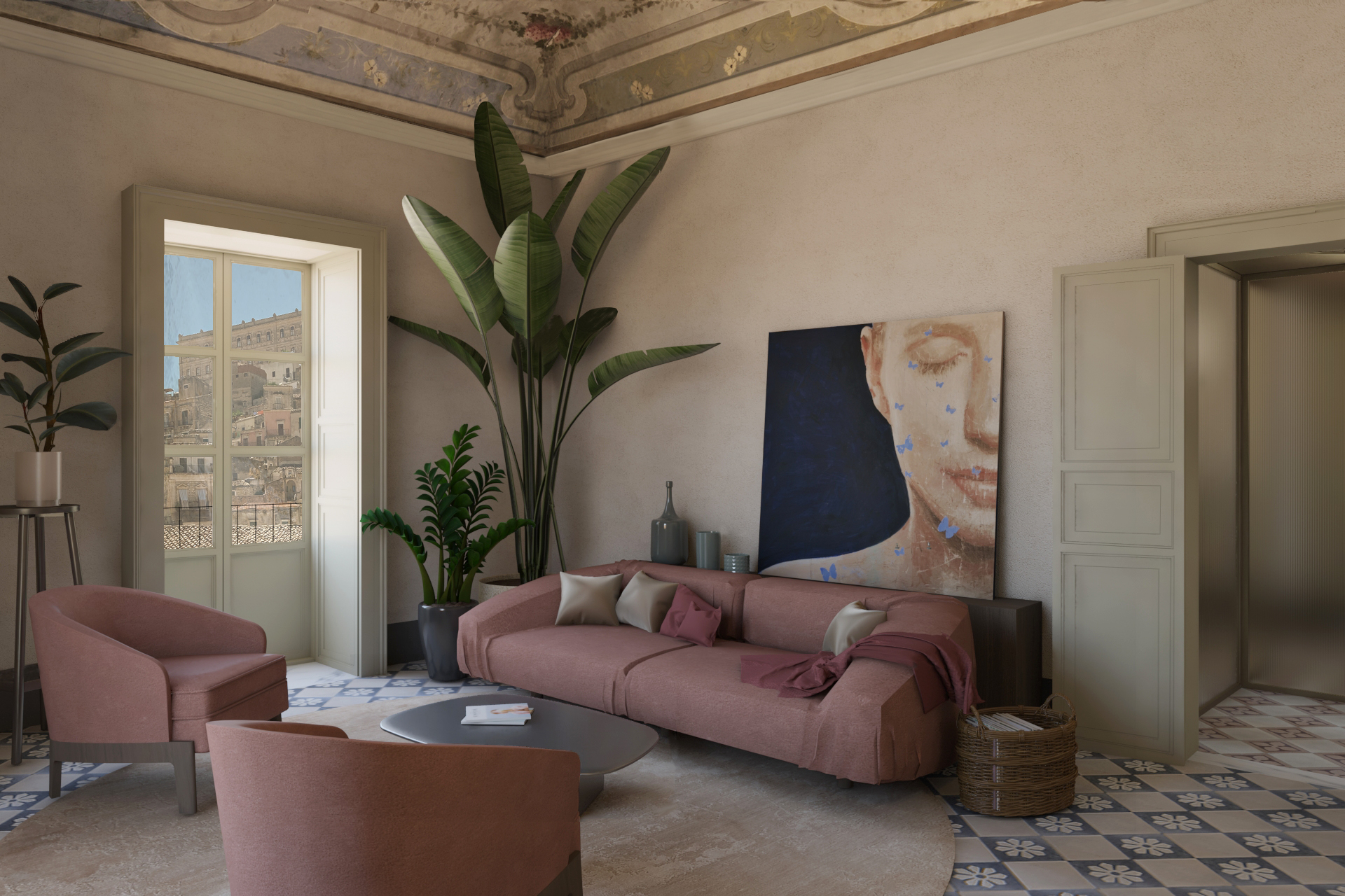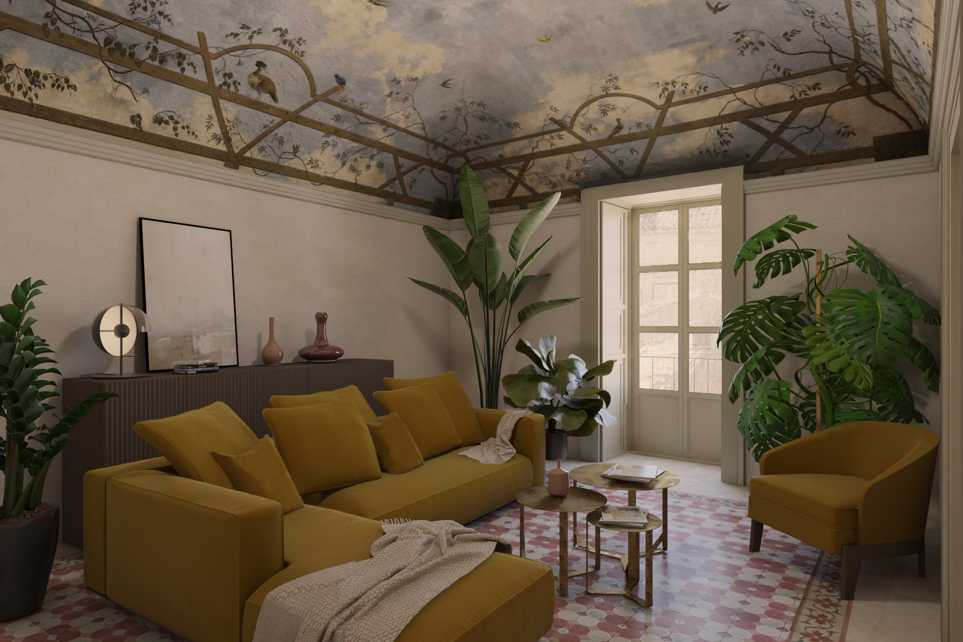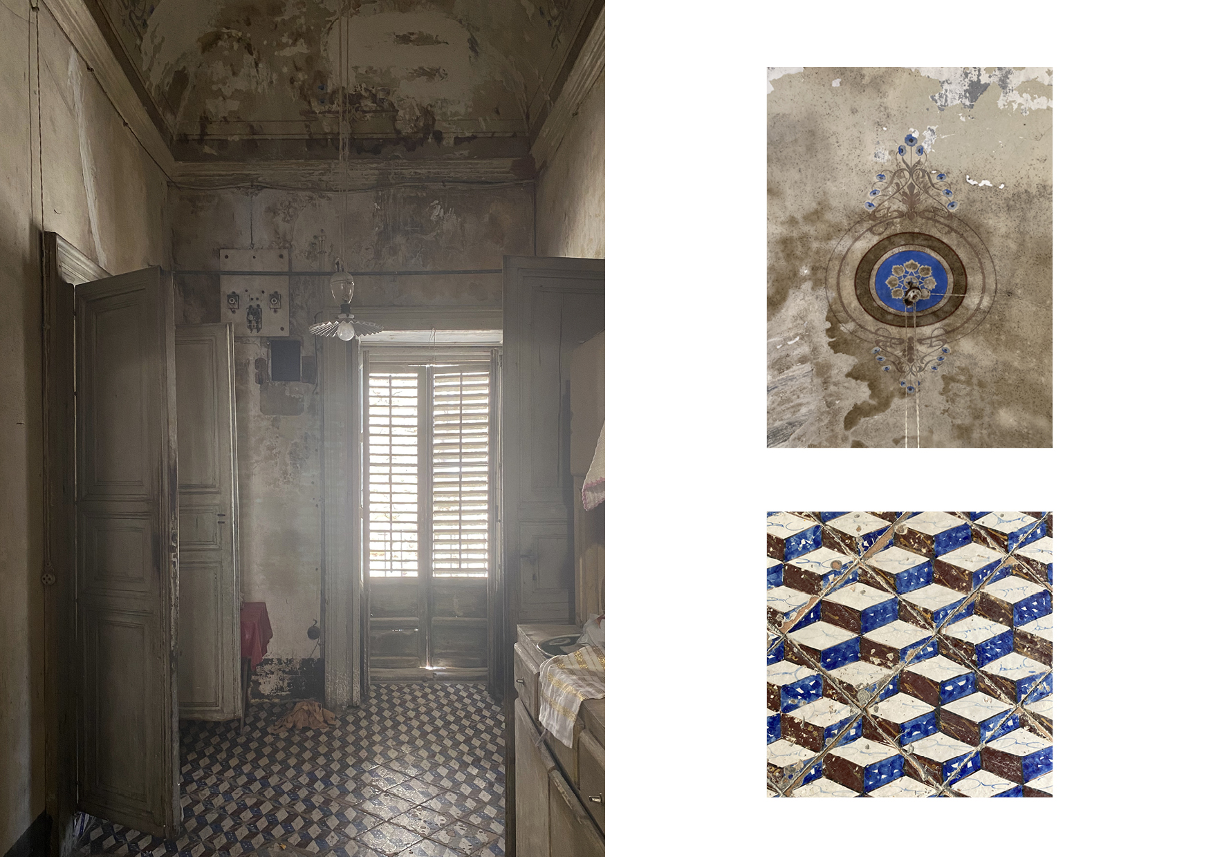 Nel palazzo si respira ancora un’atmosfera d’altri tempi, grazie allo splendido lavoro preciso e minuzioso svolto dalle maestranze ottocentesche sulle pavimentazioni, sulle volte ed infissi interni ed esterni. Quest’ultimi, infatti, sono caratterizzati da cornici ed elementi decorativi, e si innesta- no in maniera perfetta in ogni ambiente, grazie al sapiente lavoro degli artigiani curato in ogni minimo dettaglio. A decorare gli ampi saloni sono presenti volte affrescate realizzate in canne e gesso e le pavimentazioni in cementine del tempo, in cui colori, cromie, forme e geometrie si mescolano generando ambienti peculiari e unici nel suo genere.