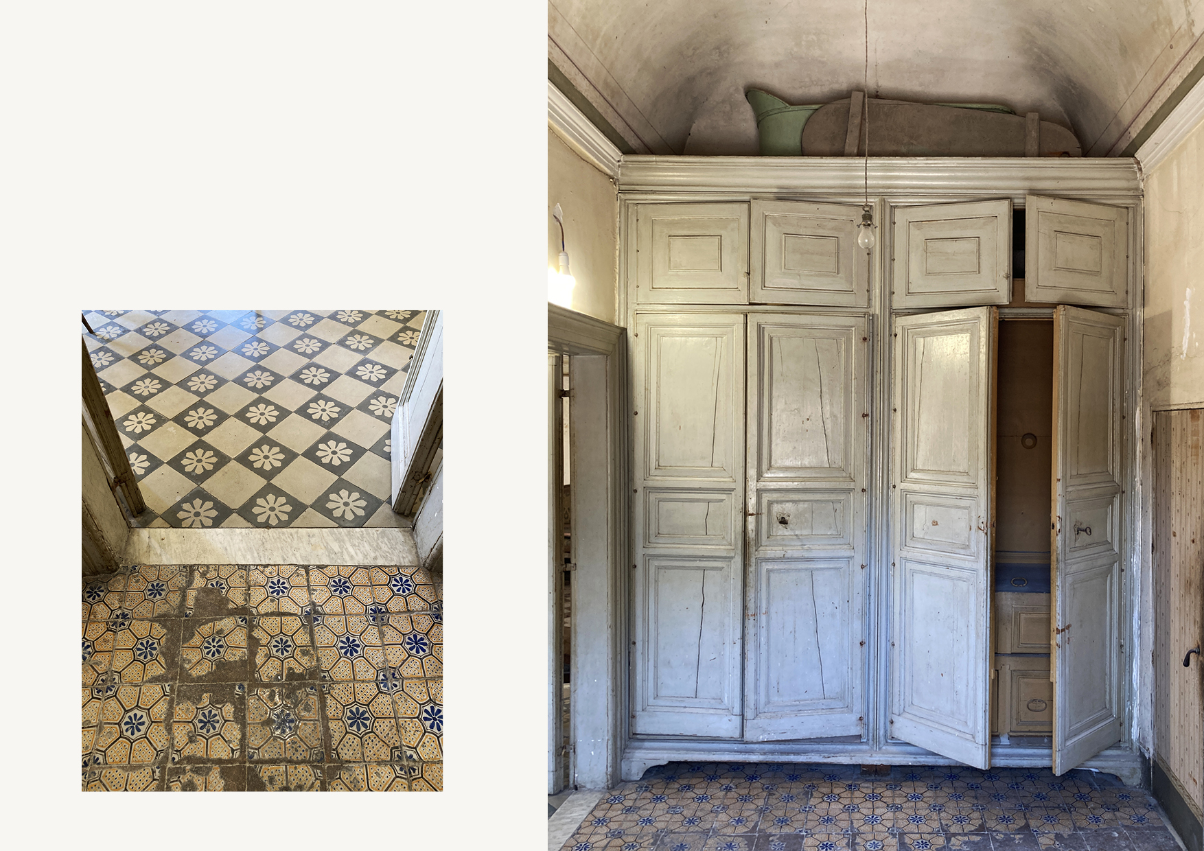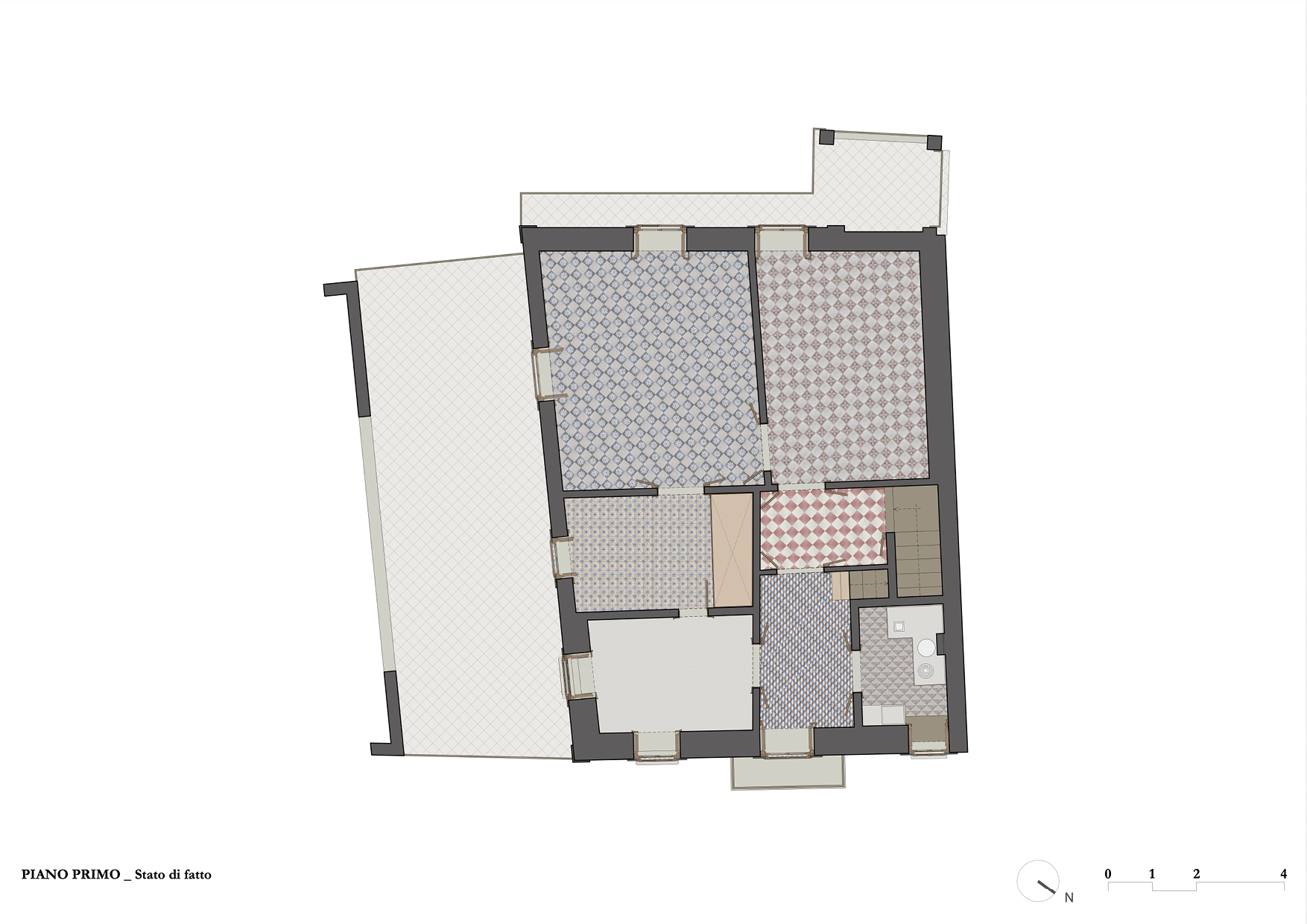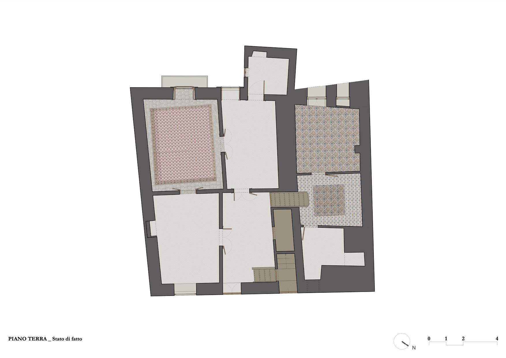 Lo stato conservativo di questi due livelli non ha permesso il mantenimento della pavimentazione, e l’unica porzione di pregio verrà ricollocata come rivestimento a parete nella piccola cucina.