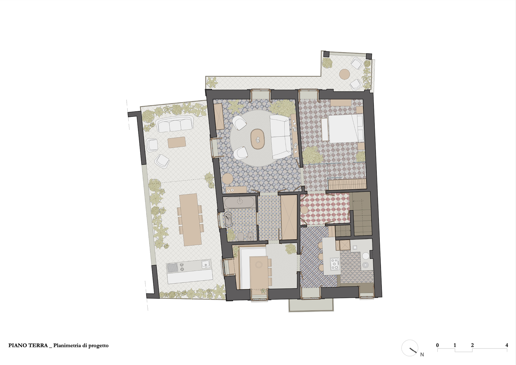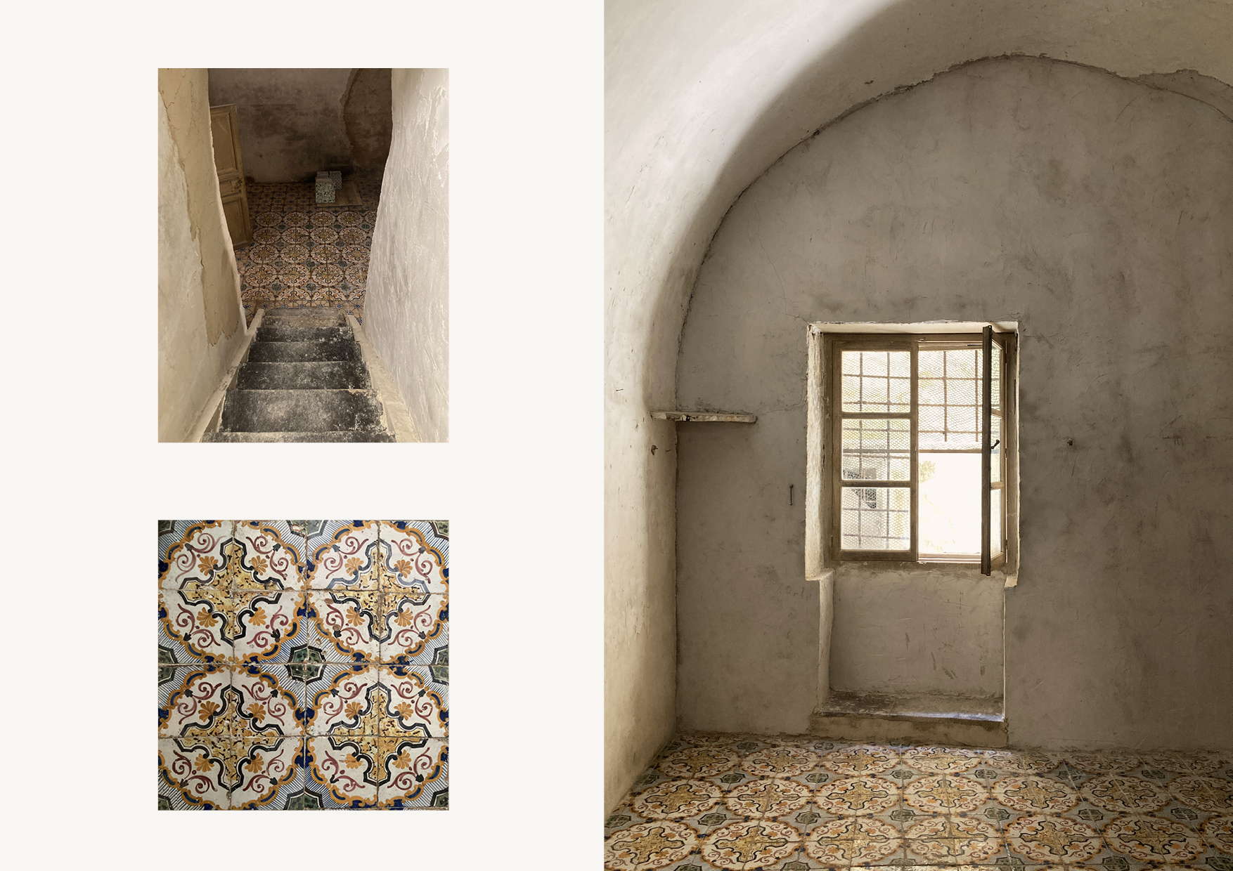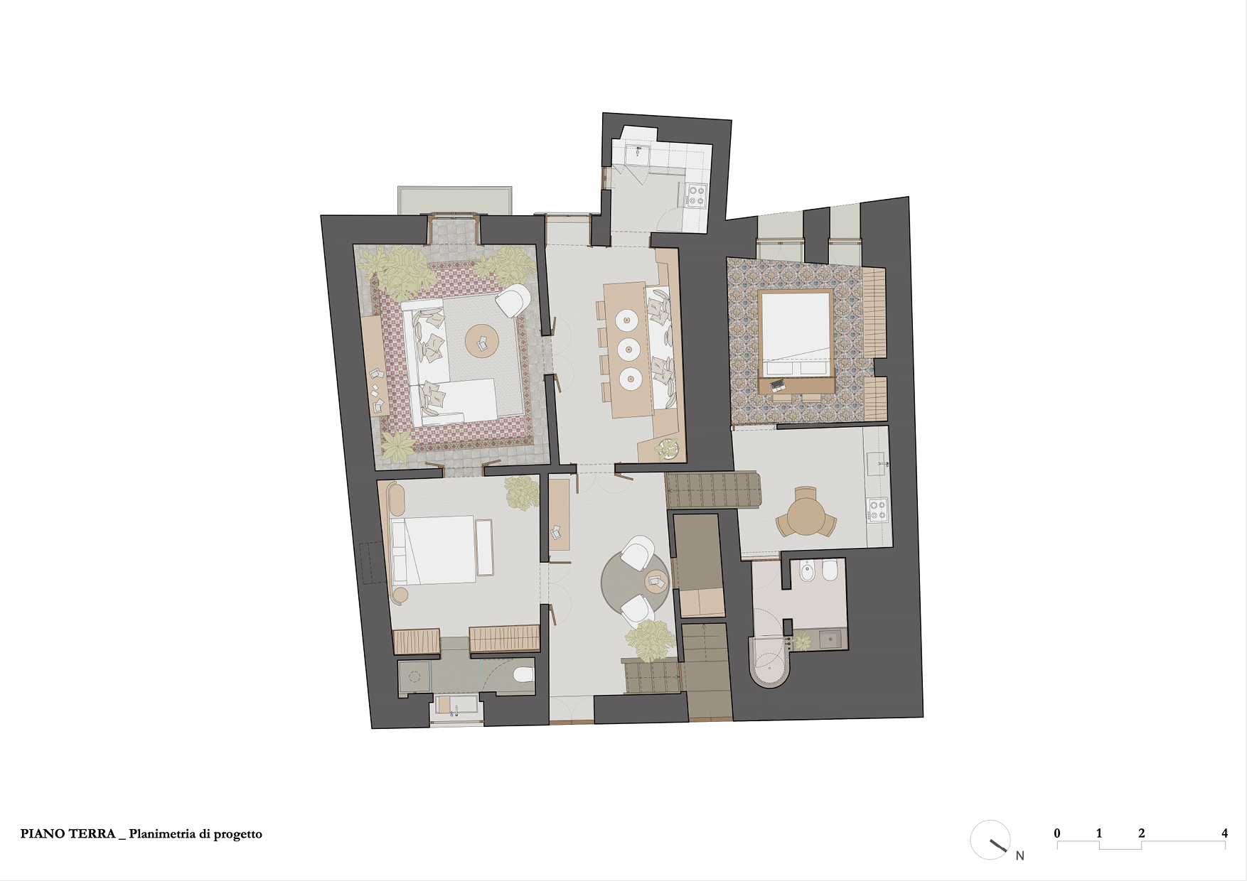 Lo stato conservativo di questi due livelli non ha permesso il mantenimento della pavimentazione, e l’unica porzione di pregio verrà ricollocata come rivestimento a parete nella piccola cucina.