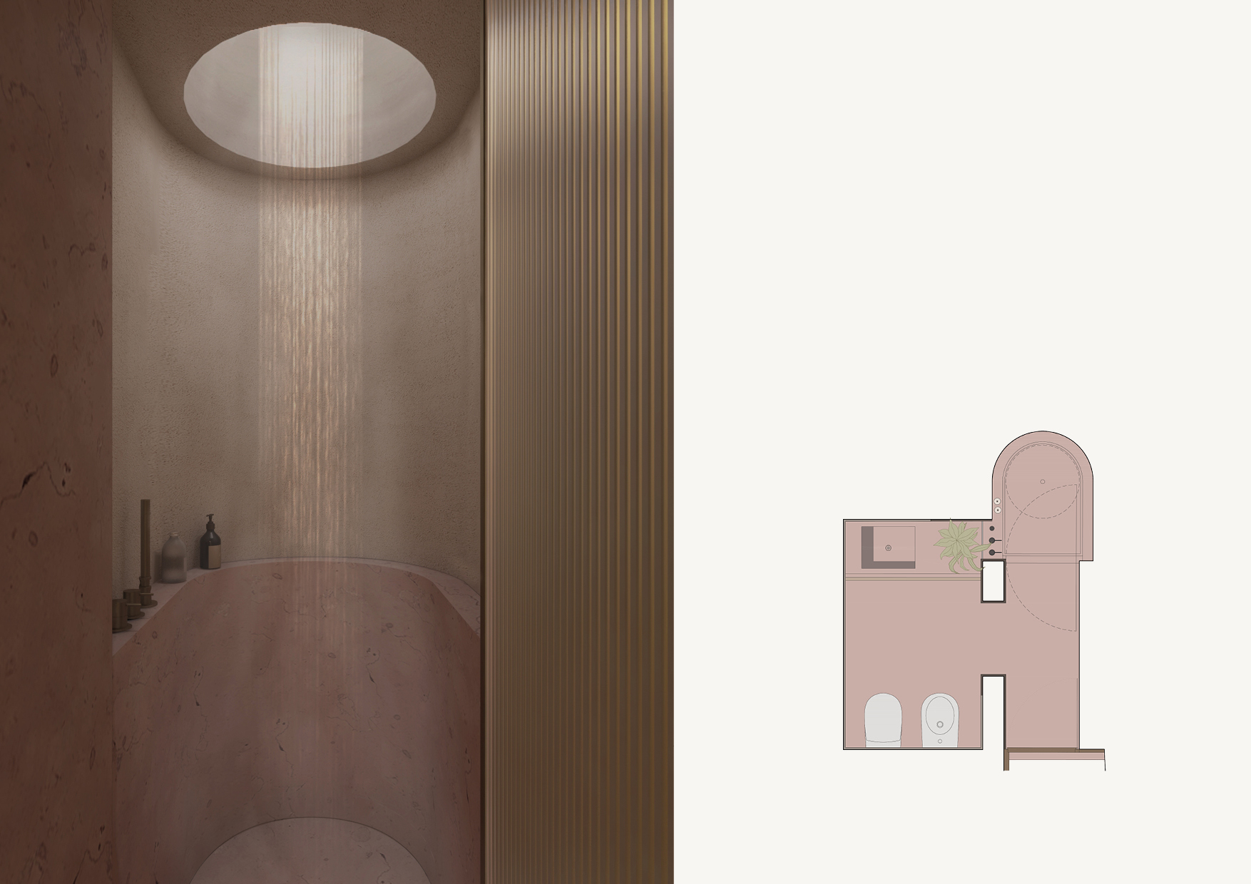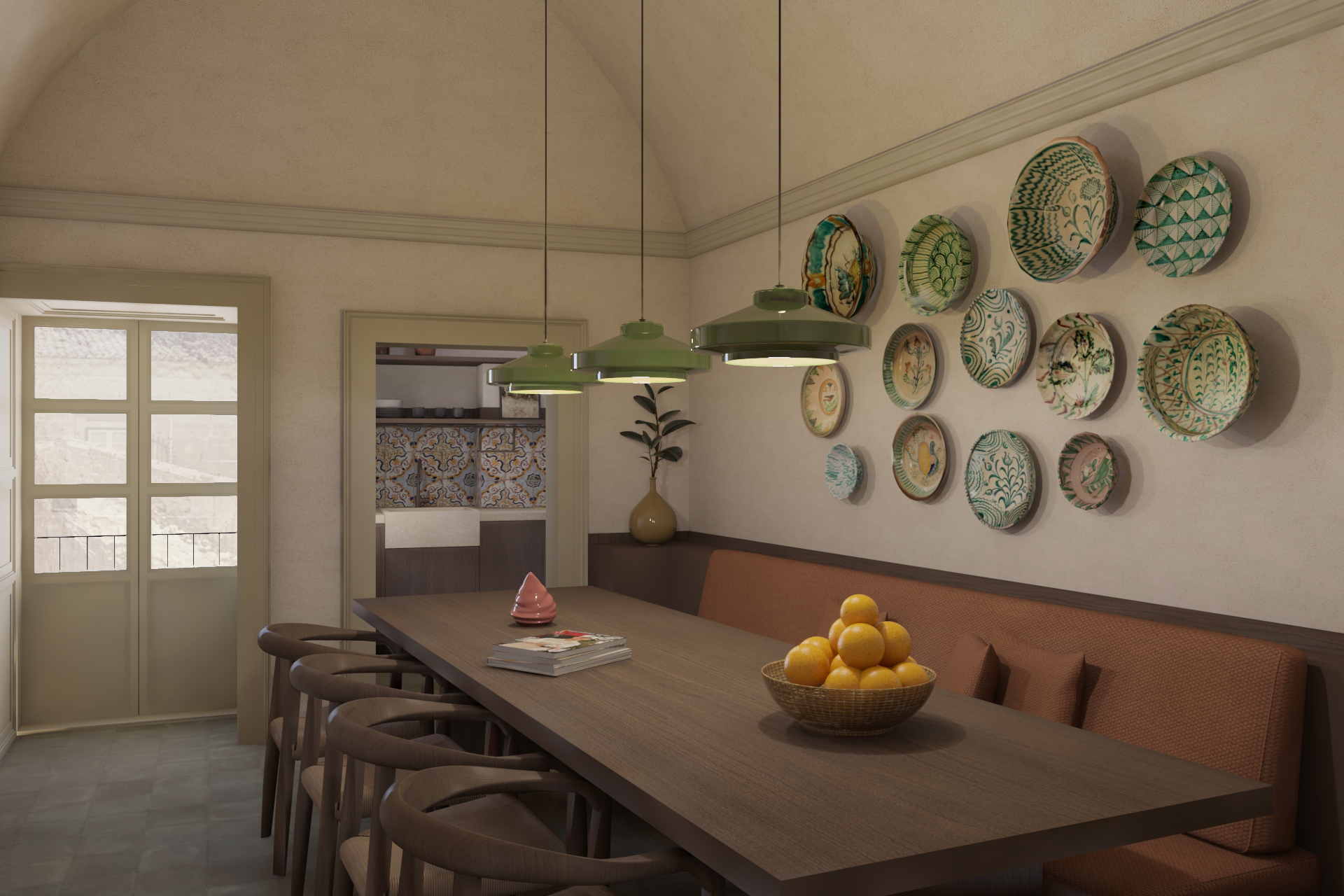 Il piano terra meno decorato e adornato rispetto al piano nobile, è caratterizzato da due livelli, collegati tra loro da un passaggio gradinato. Grazie alla sua divisione su due livelli, gli spazi sono stati trattati come due piccoli mini appartamenti. Nel livello superiore del piano terra troviamo un ambi- ente di ingresso, una piccola cucina, una camera da letto con bagno in camera, caratterizzato da pareti vetrate, e la zona giorno composta dalla sala da pranzo e living. Quest’ultima si caratterizza come fulcro della vita conviviale della casa in cui è presente l’unica volta affrescata del piano, che con le sue sfumature di celeste ed azzurro sembra quasi rappresentare uno spazio all’aperto in cui ammirare il cielo.