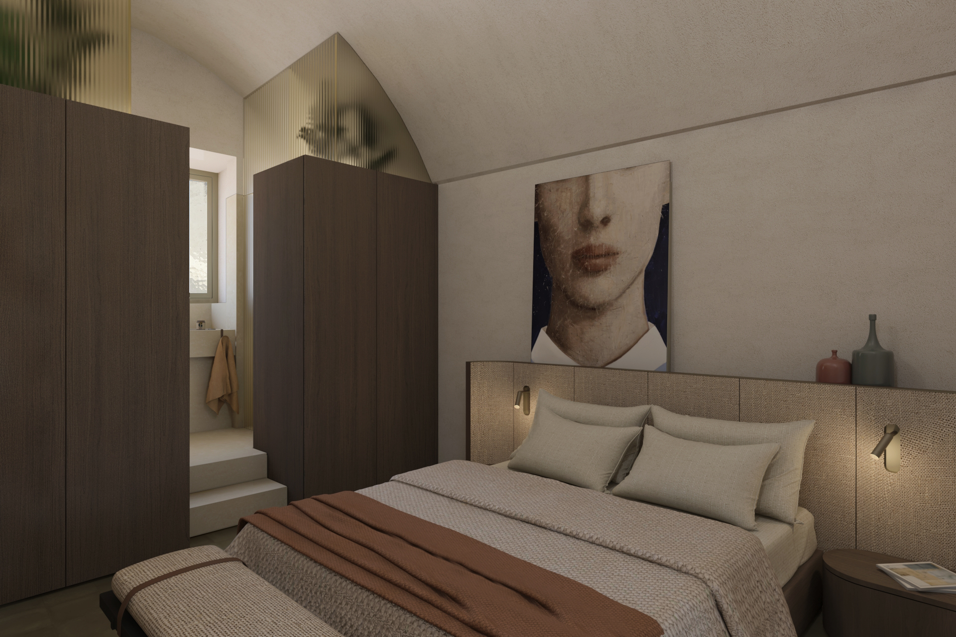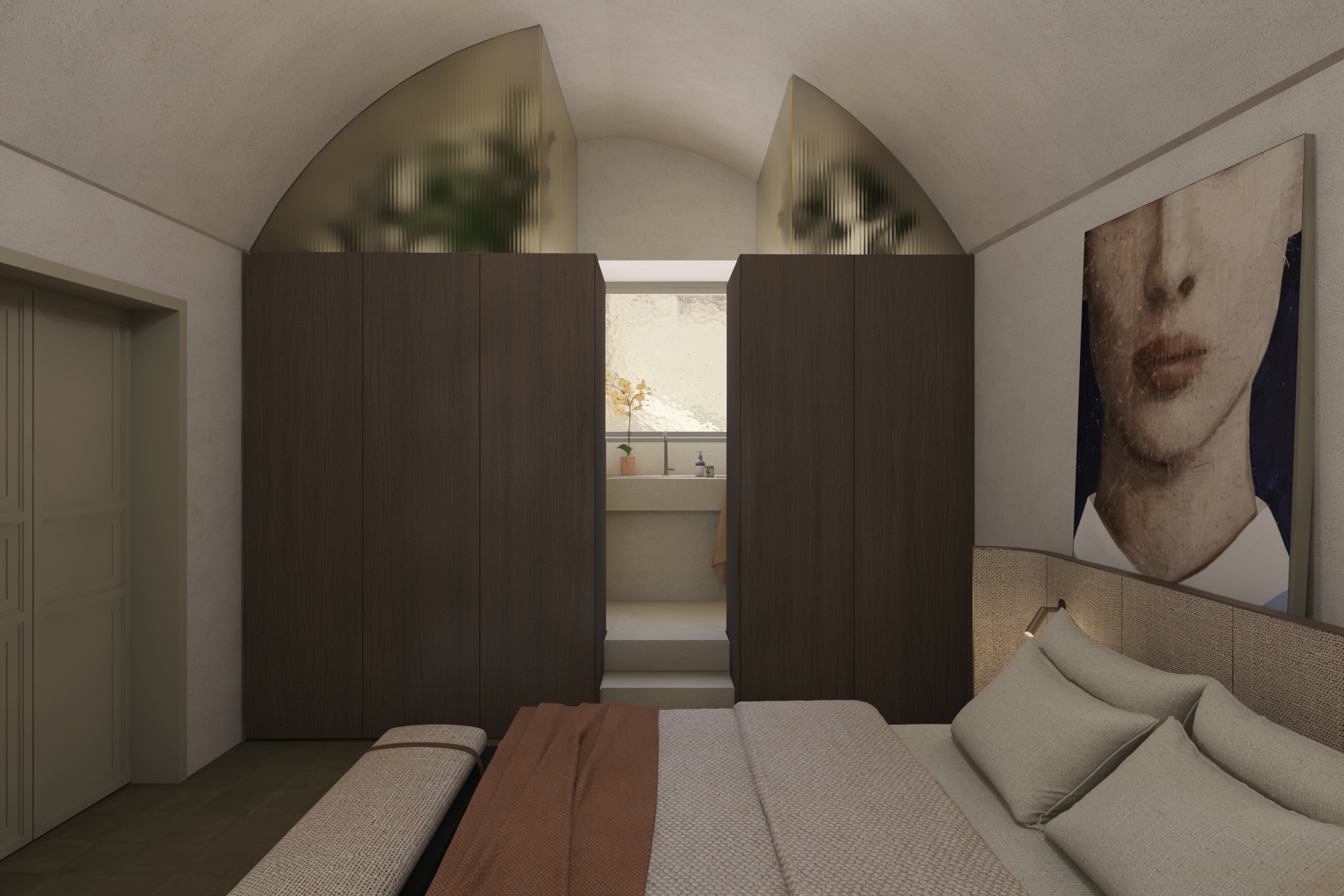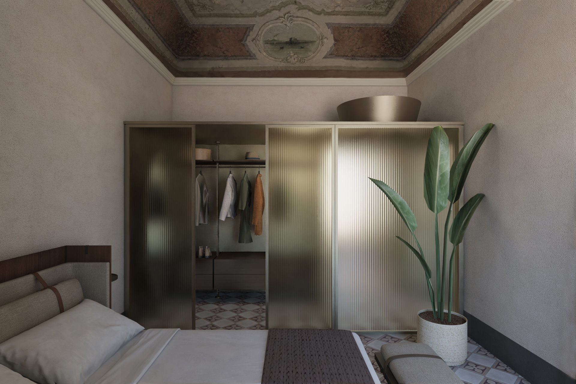 Il piano superiore è quello nobile, in cui la patina del tempo è maggior- mente visibile, grazie alla quasi totale conservazione di pavimenti ed affreschi. Il tema del recupero del mantenimento dell’esistente si evince particolarmente in questo piano, in cui si è cercato di non modificare gli ambienti presenti ma di costruire al loro interno i percorsi della spazialità. La pianta di questo piano, infatti, prevedeva una fruizione circolare per raggiungere ogni ambiente. Per tale ragione è stata inserita una parete in vetro cannettato anticato per separare l’ampio living e dando così intimità e privacy alla camera da letto.