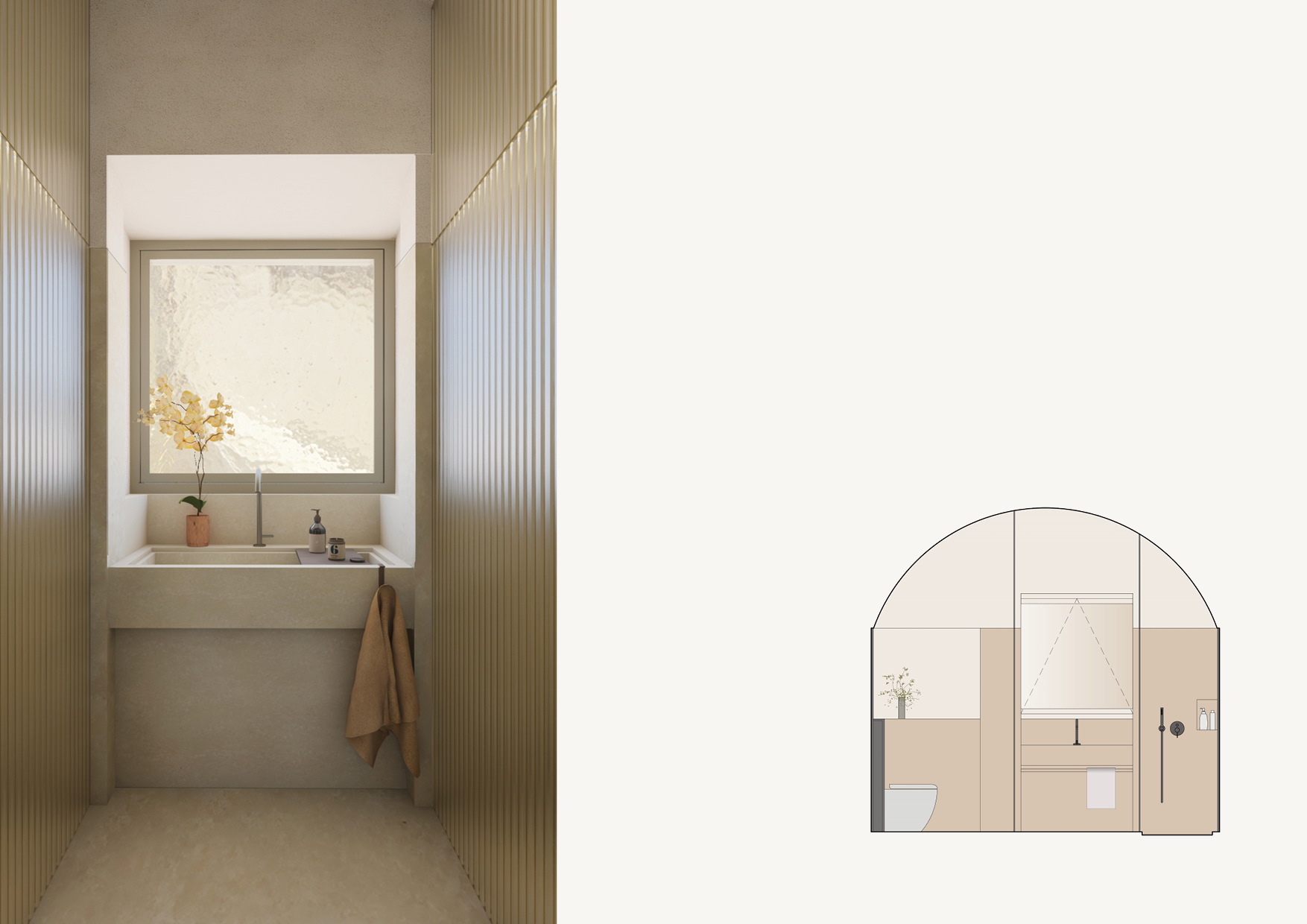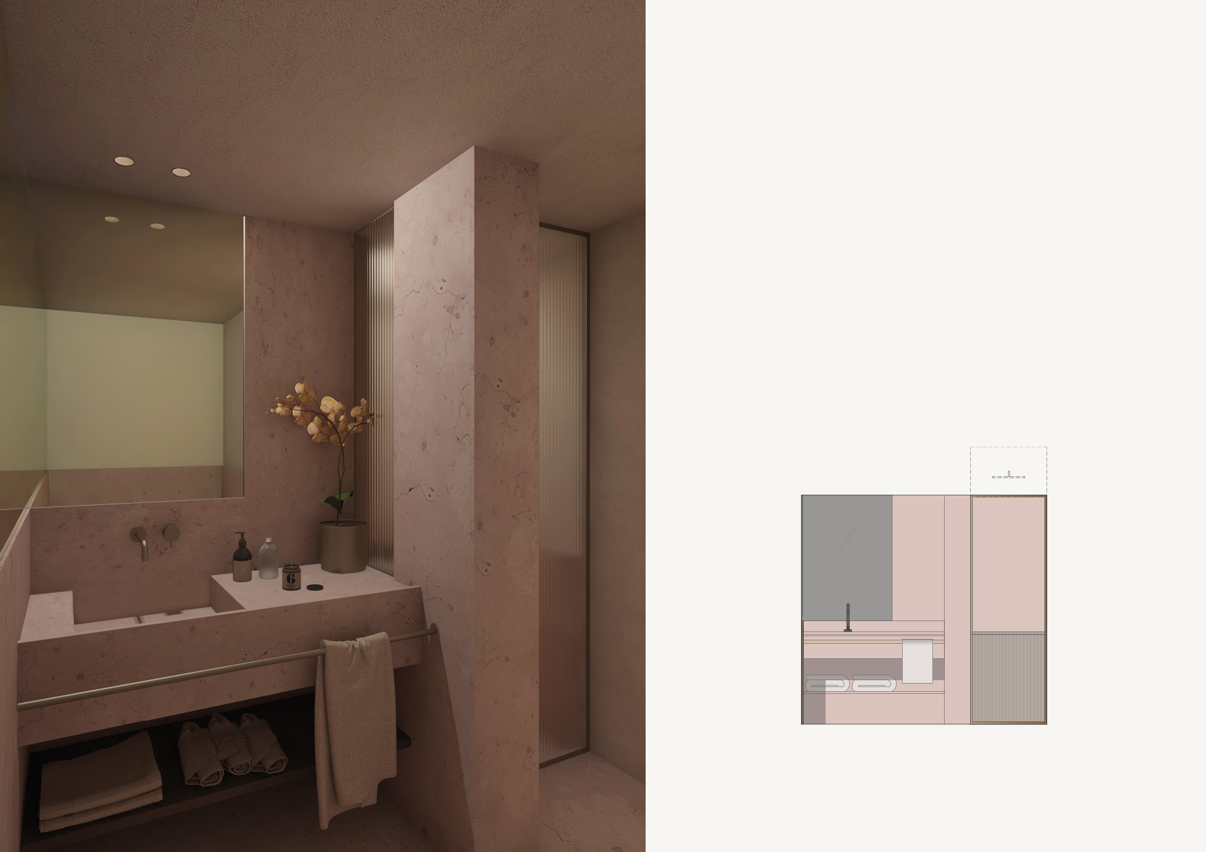 La progettazione di entrambi i piani pone l’attenzione sugli arredi, sapientemente cuciti su misura del luogo e dei committenti, al fine di dialogare al meglio con l’esistente e allo stesso tempo con chi vivrà queste spazialità. La scelta dei materiali spazia dal legno di olmo, prediligendo pietre locali e vetro cannettato, per far passare la luce e favorire ambienti più luminosi.