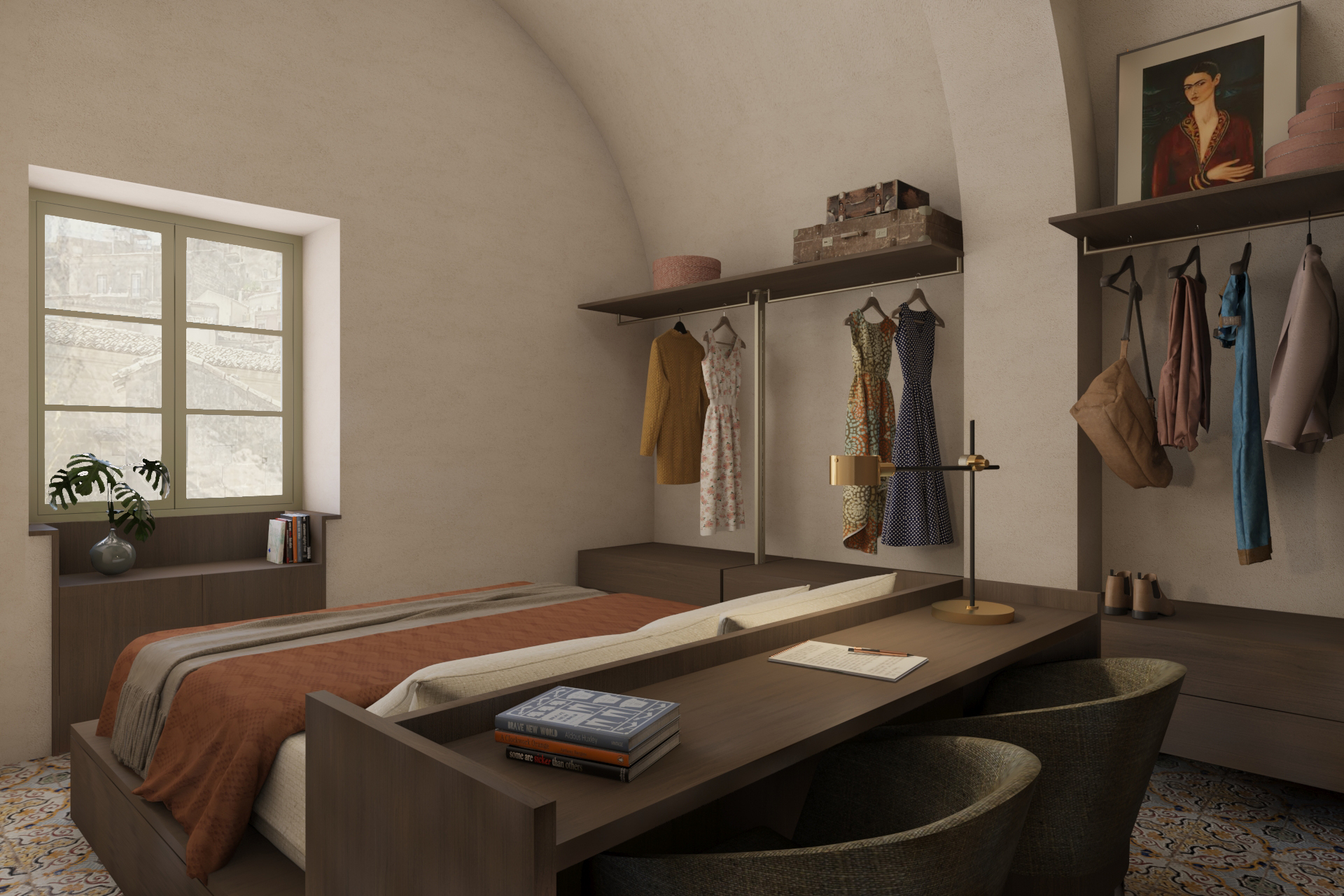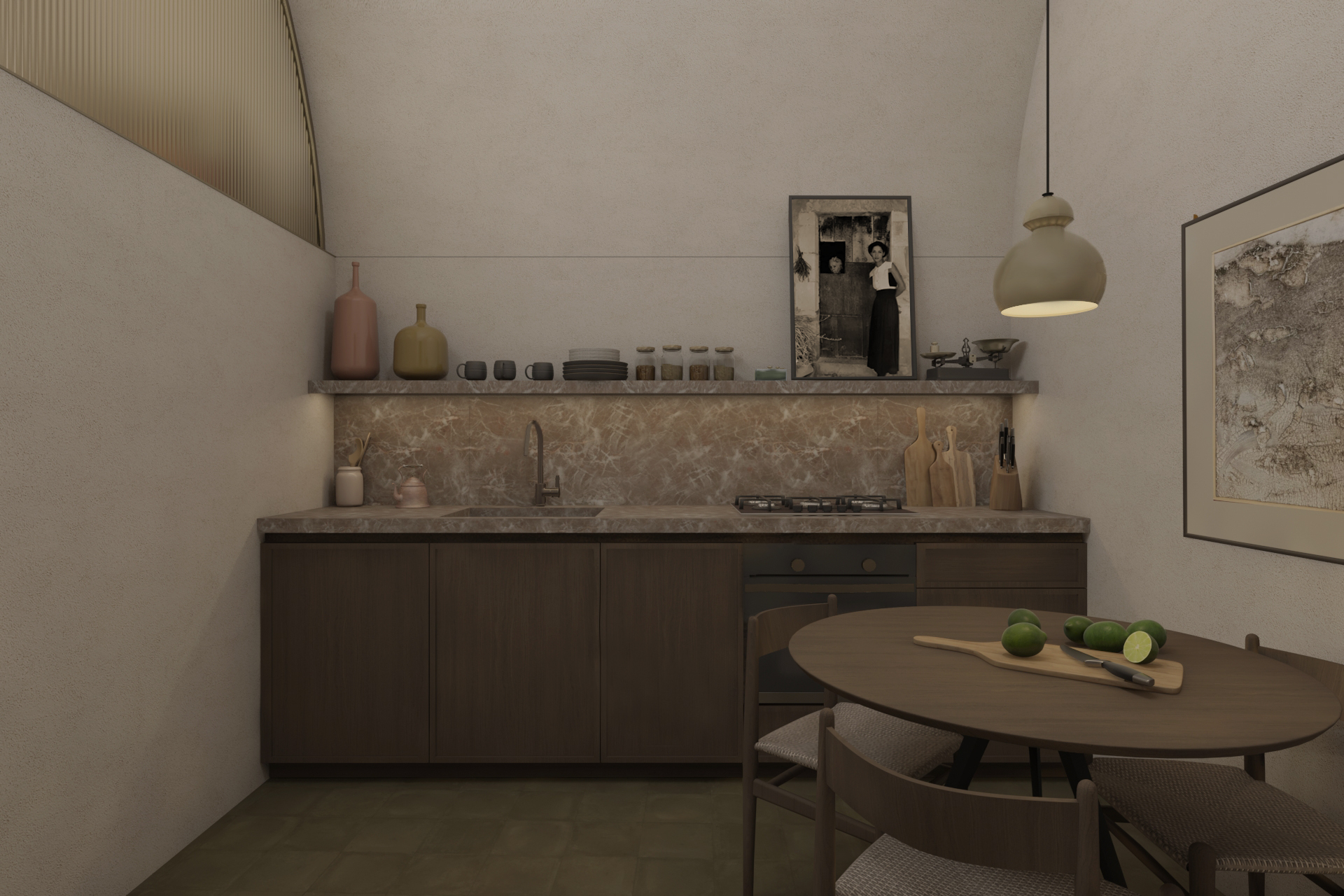 Nel livello inferiore, invece, una piccola cucina divide la camera da letto dal bagno, fungendo da spazio filtro.