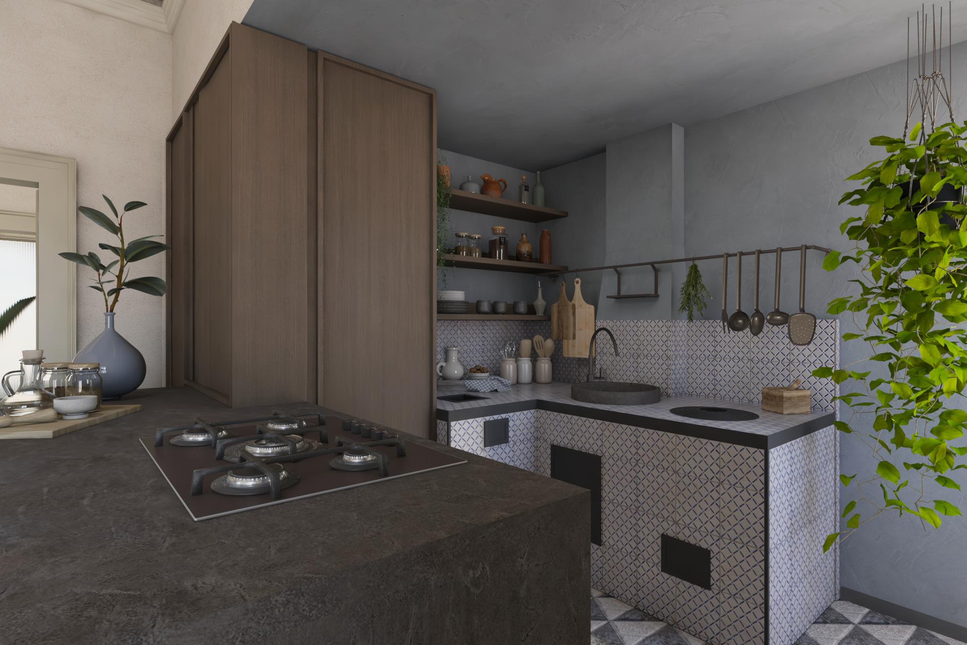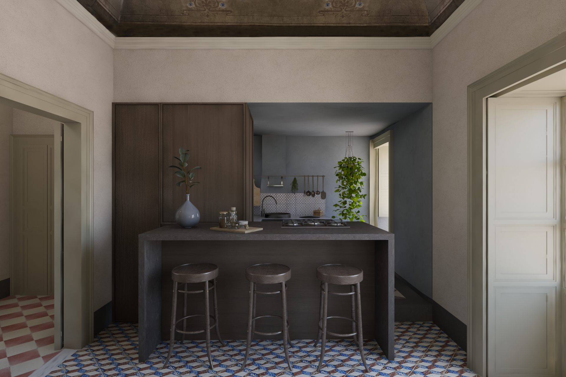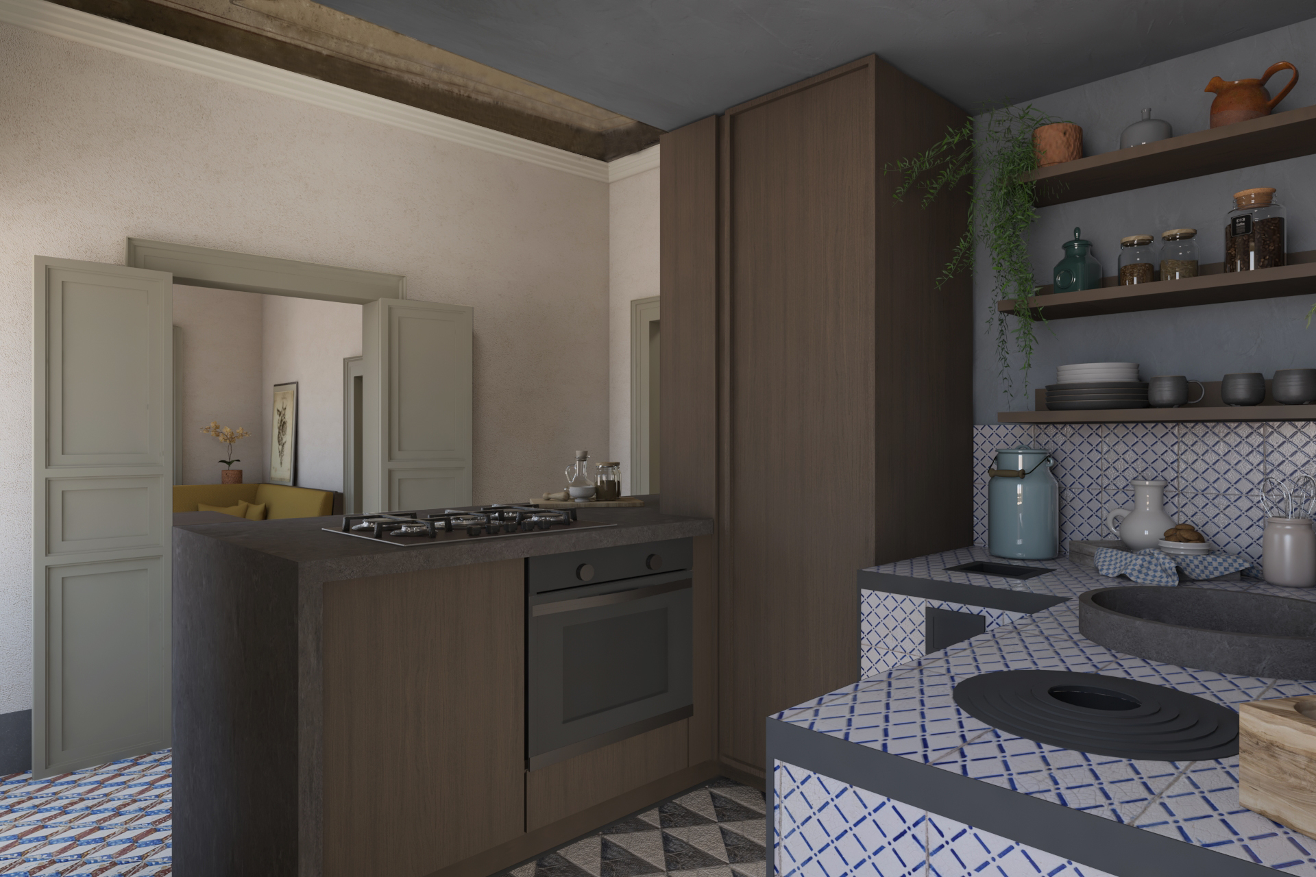 Altro elemento caratterizzate del piano nobile è la cucina antica, innestata in piastrelle bianche e blu originali che si contrappongono agli elementi in ferro presenti all’interno. Si è deciso dunque di inglobare la cucina esistente alla nuova, facendola dialogare grazie all’utilizzo del legno e della pietra di Modica, creando armonia nella scelta delle cromie e dei volumi.