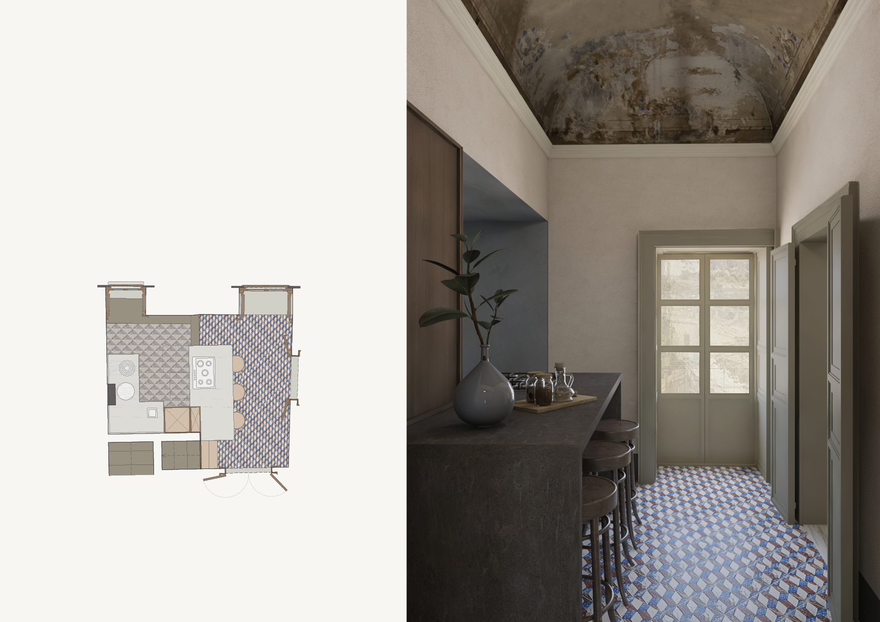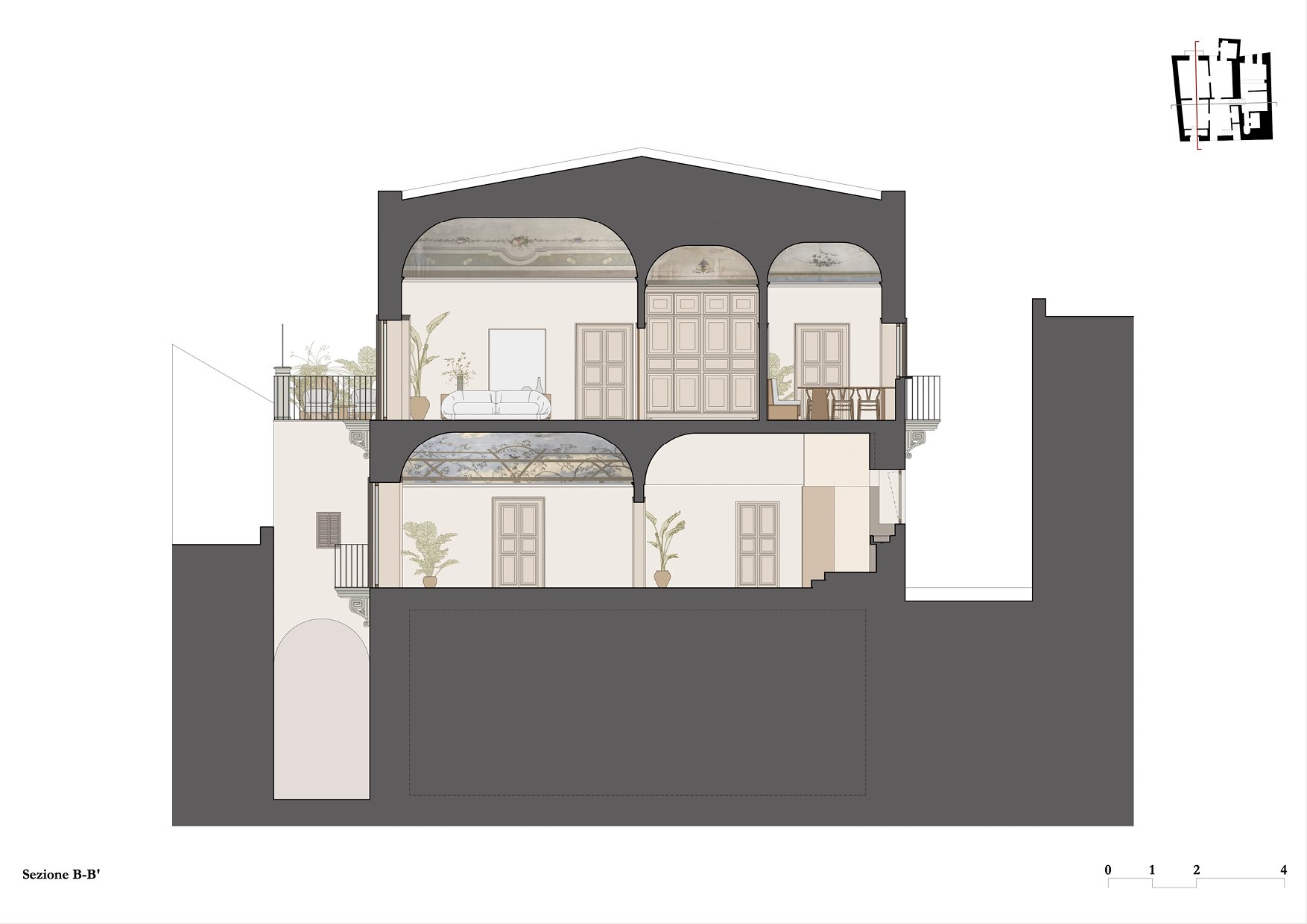 All’interno di questo scenario si inserisce il progetto di ristrutturazione conservativo: un confronto tra passato e presente volto a valorizzare e mantenere gli aspetti più autentici e originali del palazzo, e allo stesso tempo a restituire in chiave contemporanea una nuova visione degli spazi. Il progetto prevede la riorganizzazione degli ambienti, al fine ottimizzare al meglio la fruizione delle spazialità, i suoi percorsi e i suoi utilizzi, senza però realizzare modifiche strutturali importanti.