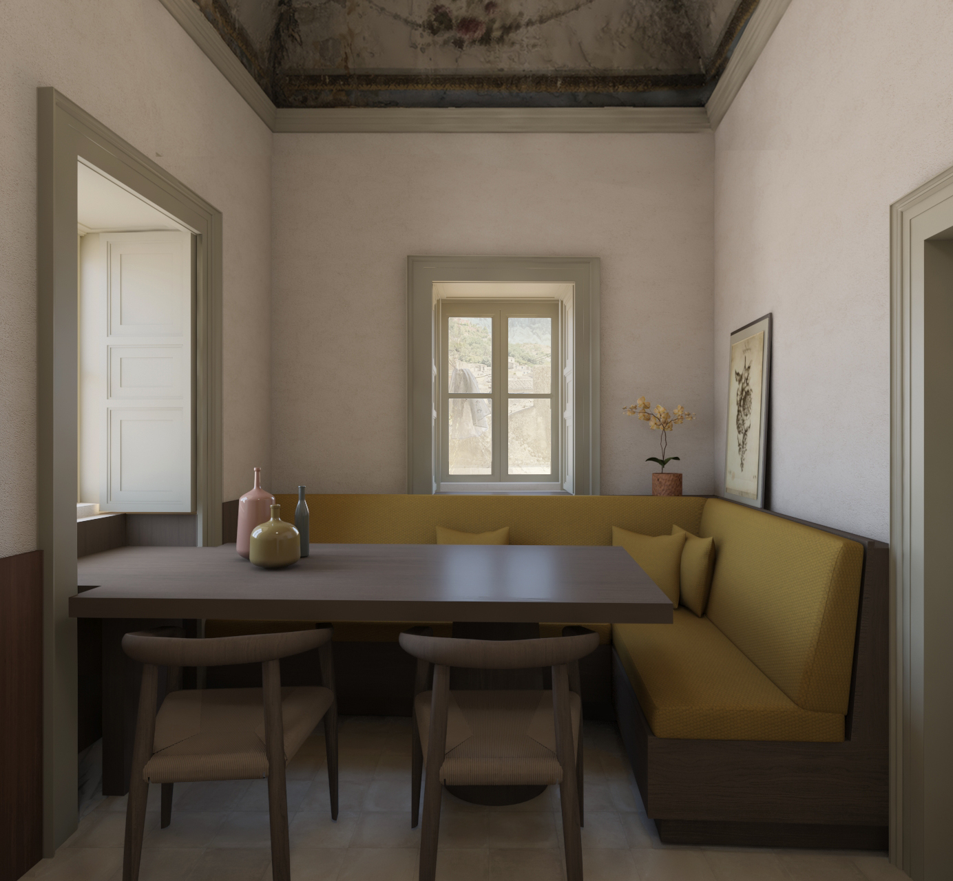L’atmosfera del palazzo diviene dunque calda e accogliente, e si inserisce sapientemente nel contesto circostante del paesaggio cittadino, dal quale si può godere anche dall’ampio terrazzo con vista sul castello. L’intervento progettuale vuole porre l’attenzione sul presente, ma allo stesso tempo vuol far riecheggiare sensazioni, piaceri, sapori e odori di un tempo lontano che fanno parte della vita del palazzo e che verranno così piacevolmente ricordati.